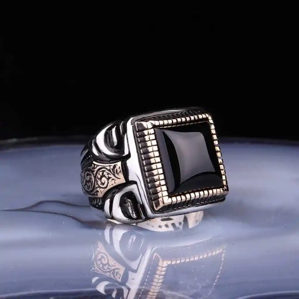 Gümüş Siyah Kare Onix Taşlı Erkek Yüzük