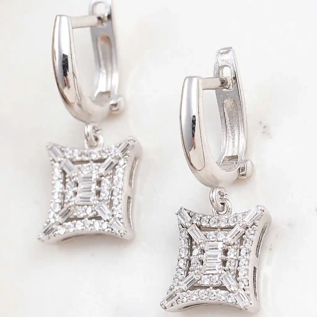 Gümüş kare zirkon taşlı kadın küpe; sade ve şık tasarımıyla kendinizin ve sevdiklerinizin severek kullanacakları bir model. Kare zirkon taşlı kadın küpe 925 ayar gümüşten imal edilmiştir. Gümüş üzerine rodyum kaplama yapılmıştır. Rodyum kaplama yapılan kadın küpe modelleri parlaklığını uzun süre muhafaza eder ve oksitlenmesi gecikir. Küpe üzerinde bulunan taşlar zirkon ve bagettir. Tüm kadın küpe modellerinde olduğu gibi kare zirkon taşlı kadın küpe de el emeği ile üretilmiştir. Gümüş ve değerli taşlar nedeniyle ürün ağırlığında ± %10 sapma olabilmektedir.