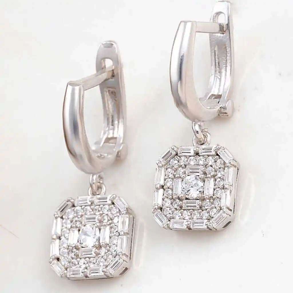 Gümüş kare zirkon taşlı kadın küpe; sade ve şık tasarımıyla kendinizin ve sevdiklerinizin severek kullanacakları bir model. Kare zirkon taşlı kadın küpe 925 ayar gümüşten imal edilmiştir. Gümüş üzerine rodyum kaplama yapılmıştır. Rodyum kaplama yapılan kadın küpe modelleri parlaklığını uzun süre muhafaza eder ve oksitlenmesi gecikir. Küpe üzerinde bulunan taşlar zirkon ve bagettir. Tüm kadın küpe modellerinde olduğu gibi kare zirkon taşlı kadın küpe de el emeği ile üretilmiştir. Gümüş ve değerli taşlar nedeniyle ürün ağırlığında ± %10 sapma olabilmektedir.