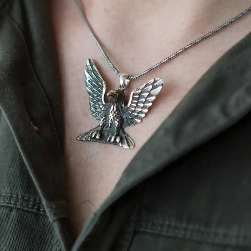 Kuşların kralı olan ve savaşmak üzere dünyaya inen kartal, özellikle savaşçı ve güçlü olmasıyla tanınır; bu yüzden pek çok ulusun sembolü olmuştur. Bu derin anlamdan esinlenerek oluşturulan kartal erkek kolye; kendinize yada sevdiklerinize doğum gününde, babalar gününde yada özel günlerde hediye edebilirsiniz. Bu şık erkek kolye; 925 ayar gümüşten imal edilmiştir. Gümüş üzerine oksit kaplama yapılmıştır. Oksit kaplama yapılan kolyeler parlaklığını uzun süre muhafaza eder. Tüm erkek kolyelerde olduğu gibi gümüş kartal erkek kolye de el emeği ile üretilmiştir. Gümüş ve değerli taşlar nedeniyle belirtilen ortalama ürün ağırlığında ± %10 sapma olabilmektedir.