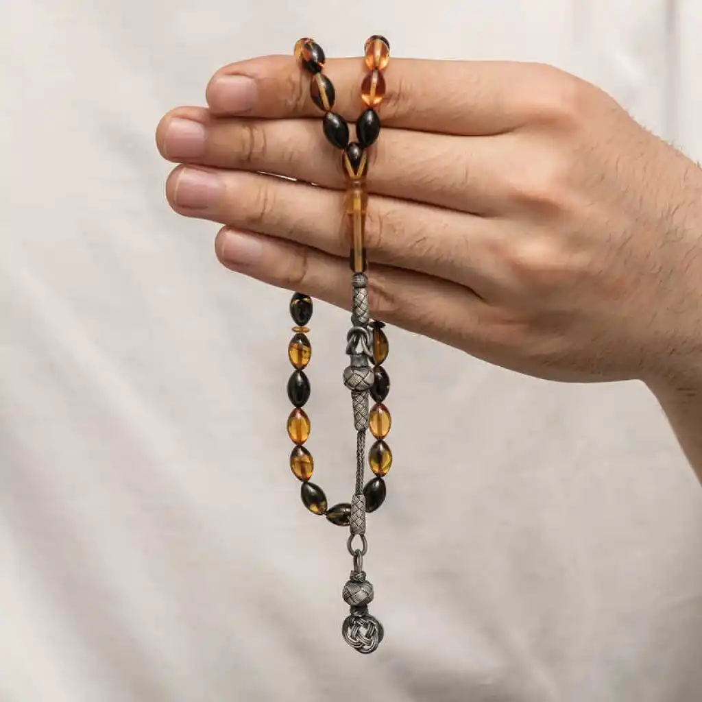 Kehribar, çam ağacı reçinesinin toprak altında uzun yıllar boyunca birikerek oluşan bir maddedir. Hemen hemen taş ile aynı sertliktedir fakat yoğunluğu düşüktür. Çam kokusu yayar. Oluşumu uzun zaman aldığından ve yapay olarak yapılamadığından değerli bir maddedir. Sıkma kehribar ise kehribar taşından farklı olarak onun özelliklerini taşıyan, görüntü itibariyle ona benzeyen fakat gerçek olmayan bir malzemedir. Ülkemizde ve dünyanın bir çok yerinde kehribar taşından çeşitli malzemeler üretilmiştir. Ülkemizde en yaygın olarak tesbih üretilmektedir. Kehribar tesbihler elde ısındıkça kehribar benzeri bir koku verir ve renk değiştirir. Bir çok rengi vardır. Hatta iki rengin birleşiminden oluşan kehribar tesbih modelleri de vardır. Genellikle gümüş püskül ile kullanılır veya sistemli olarak da kullanılabilir. Ülkemizin güzide tesbih ustaları bu malzemeyi sıklıkla işlemek suretiyle çeşitli sanat eserleri meydana getirirler. Bu tesbihler de koleksiyonerler tarafından alınıp satılmaktadır. Gümüş 1000 ayar kazaz püsküllü sıkma kehribar tesbih modeli de günlük hayatta kullanılabilecek çok şık bir tesbih çeşididir. Özel günlerin vazgeçilmez hediyesi sıkma kehribar tesbihler erkekler için doğum günü, sevgililer günü ve babalar günü gibi özel zamanlarda hediye olarak tercih edilebilir. Gümüş kazaz püsküllü sıkma kehribar tesbih modeli diğer kehribar tesbih modellerinde olduğu gibi tamamen el emeği ile imal edilmiştir.