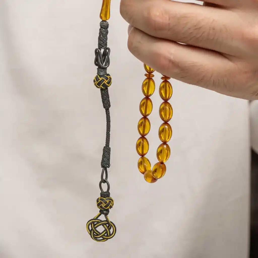 Kehribar, çam ağacı reçinesinin toprak altında uzun yıllar boyunca birikerek oluşan bir maddedir. Hemen hemen taş ile aynı sertliktedir fakat yoğunluğu düşüktür. Çam kokusu yayar. Oluşumu uzun zaman aldığından ve yapay olarak yapılamadığından değerli bir maddedir. Sıkma kehribar ise kehribar taşından farklı olarak onun özelliklerini taşıyan, görüntü itibariyle ona benzeyen fakat gerçek olmayan bir malzemedir. Ülkemizde ve dünyanın bir çok yerinde kehribar taşından çeşitli malzemeler üretilmiştir. Ülkemizde en yaygın olarak tesbih üretilmektedir. Kehribar tesbihler elde ısındıkça kehribar benzeri bir koku verir ve renk değiştirir. Bir çok rengi vardır. Hatta iki rengin birleşiminden oluşan kehribar tesbih modelleri de vardır. Genellikle gümüş püskül ile kullanılır veya sistemli olarak da kullanılabilir. Ülkemizin güzide tesbih ustaları bu malzemeyi sıklıkla işlemek suretiyle çeşitli sanat eserleri meydana getirirler. Bu tesbihler de koleksiyonerler tarafından alınıp satılmaktadır. Gümüş 1000 ayar kazaz püsküllü sıkma kehribar tesbih modeli de günlük hayatta kullanılabilecek çok şık bir tesbih çeşididir. Özel günlerin vazgeçilmez hediyesi sıkma kehribar tesbihler erkekler için doğum günü, sevgililer günü ve babalar günü gibi özel zamanlarda hediye olarak tercih edilebilir. Gümüş kazaz püsküllü sıkma kehribar tesbih modeli diğer kehribar tesbih modellerinde olduğu gibi tamamen el emeği ile imal edilmiştir.
