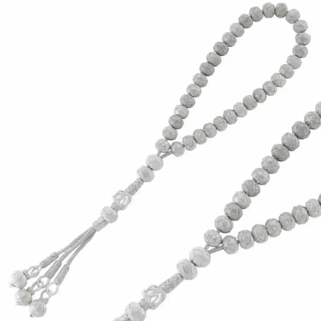 Tesbih, türk-islam kültüründe asırlar boyunca dilden dile gönülden gönüle aktarılan dualarda önemli bir miras öğesi olarak her zaman yer alır. İslâm-Türk medeniyetinde tesbih, kültür motifi ve dua aracı olarak önemli bir kilometre taşı olma hüviyetine sahiptir. Gönüllerinde her daim zikir bulunan mümin ve mütevekkil tesbih ustalarımız, asırlar boyunca tesbih yapımını, eskimez medeniyetimizin bir sanat konusu hâline getirmiştir. Yine, yüzyıllar boyunca tesbih ustalarının parmakları arasından dökülen dua taneleri, şüphesiz önce inanç sahiplerinin, daha sonra da ticari ya da gayrı ticari koleksiyonerlerin vazgeçemediği bir unsur haline gelmiştir. Yürekleri duadan incelmiş Hak erleri her daim tesbihine sahip çıkmıştır. Erkek için alınabilinecek anlamlı bir hediye olan Tesbih modelleri, mertliğin dürüstlüğün ve inancın da sembolüdür. Tesbih severlerin ve koleksiyoncuların en fazla ilgisini çeken modellerden biri de el emeği göz nuru kazaz tesbihlerdir. Tesbih tamamen saf gümüş iplerin örülmesi şeklinde yapılarak hazırlanmaktadır. Siz de iyi bir tesbih severseniz veya bu tarz tesbihlere merakınız varsa, Trabzon kazaz tesbihler tam size göre... Ürünlerimizin tamamı el emeği ile üretilmiştir. Gümüş ve değerli taşlar nedeniyle belirtilen ortalama ürün ağırlığında ± %10 sapma olabilmektedir.
