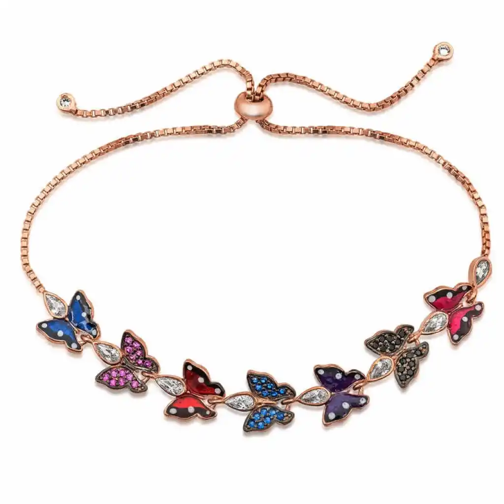 Kelebek simgesi; huzur, mutluluk, gençlik ve romantizm duygularının tekrar canlanması, temiz ve saf bir sevgi değeri taşımaktadır. Bayanların genellikle kolye ve bilekliklerde kullandıkları son derece zarif görüntü sunan kelebek modelleri; Yunan ve Uzak Doğu takı dünyasında popüler bir yer almakta, bedenin olgunlaşması temsil etmektedir. Psikolojik olarak ise kelebek modelleri için ruhun değişimi ve yenilenmesi olarak anlatılmaktadır. Bu şık bileklik; doğum günü hediyesi, sevgililer günü veya özel günlerde tercih edilebilecek mükemmel bir seçenektir. Bileklik 925 ayar gümüşten üretilmiştir. Gümüş üzerine rose altın kaplama yapılmıştır. Rose altın kaplama yapılan bayan bileklikler parlaklığını uzun süre muhafaza eder, gümüş rengini pembe renge dönüştürür ve oksitlenmeyi geciktirir. Tüm gümüş bilekliklerde olduğu gibi gümüş kelebek bileklik de el emeği ile üretilmiştir. Üzerinde bulunan taşlar zirkondur. Gümüş ve değerli taşlar nedeniyle belirtilen ürün ağırlığında ± %10 sapma olabilmektedir.
