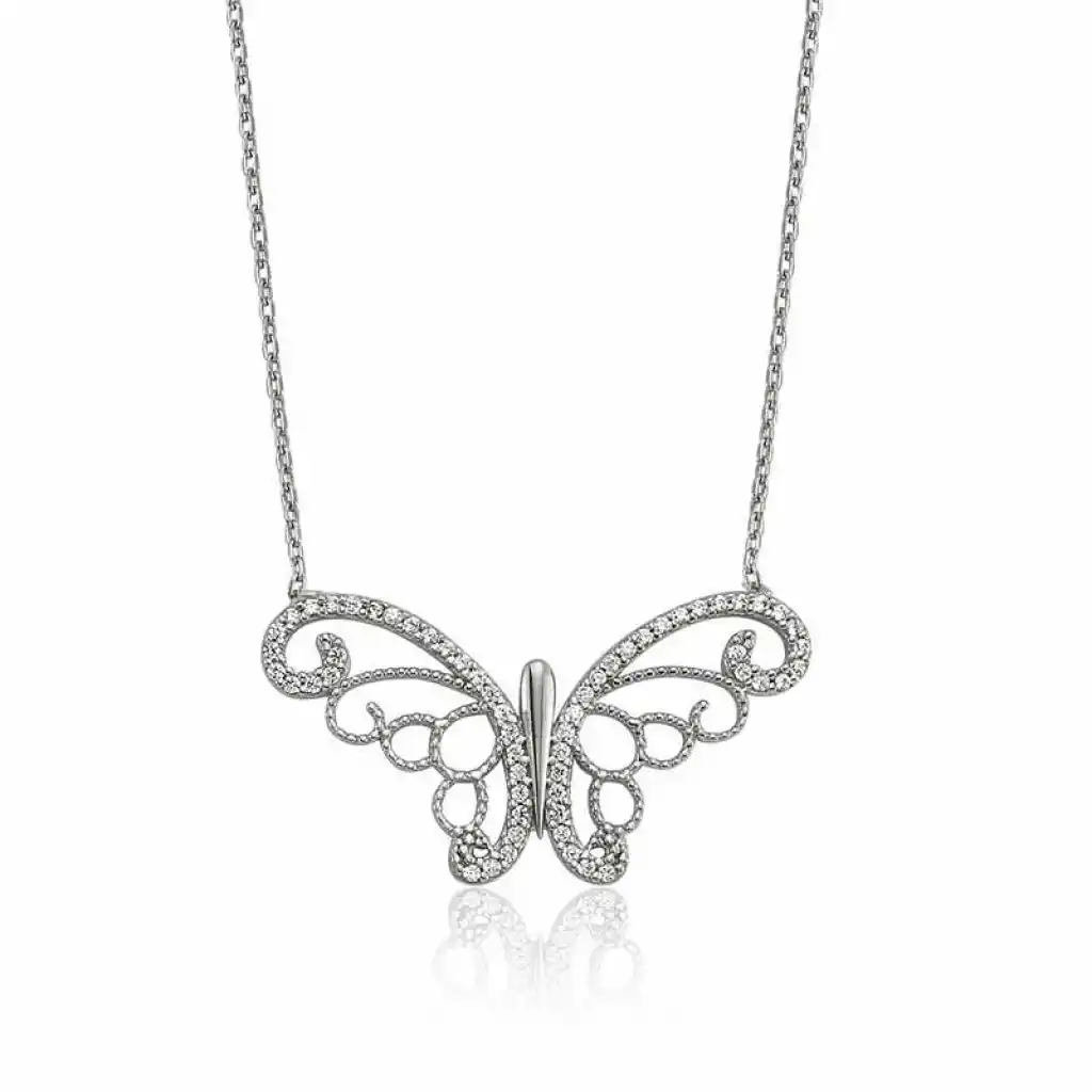 Kelebek tertemiz sevginin, saflığın ve aşkın ifadesidir. Minicik bir tırtılken kendi ördükleri kozanın içerisine girip sabırla bekledikten sonra bambaşka bir görünüm ve güzellik ile kelebeğe dönüşüm yaşanması kelebek kolye modelleri için de ilham kaynağı olmuştur. Kelebek kolye aşkın küçük bir kıvılcım ile başladığı daha sonra büyük bir sabır ile büyüdüğü ve en sonunda kozasından çıkarak ilan-ı aşk edilmesidir. Sizin olduğu kadar sevdiklerinizin de keyifle takacağı gümüş kelebek bayan kolye en güzel hediyelerden biri olacaktır. Kelebek bayan kolye 925 ayar gümüşten imal edilmiştir. Gümüş üzerine rodyum kaplama yapılmıştır. Rodyum kaplama yapılan gümüş bayan kolye modelleri parlaklığını uzun süre muhafaza eder ve oksitlenmesi gecikir. Kolye üzerinde bulunan taşlar zirkondur. Gümüş olan zincir boyu ortalama 45 cm"dir. Bu kelebek bayan kolye diğer gümüş bayan kolye modelleri gibi el emeği ile üretilmiştir. Gümüş ve değerli taşlar nedeniyle belirtilen ürün ağırlığında ± %10 sapma olabilmektedir.