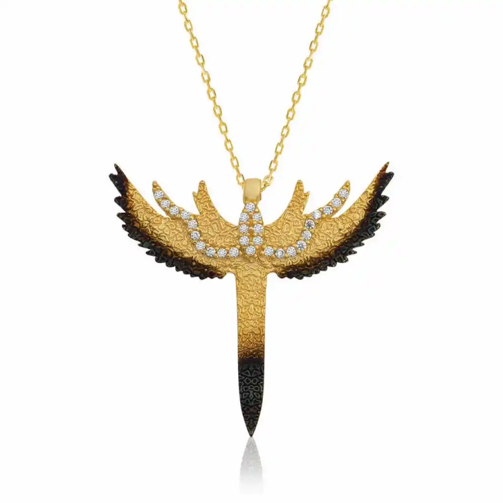 Bu şık bileklik doğum günü hediyesi, sevgililer günü hediyesi veya annelere hediye olarak özel günlerde tercih edilebilecek mükemmel bir seçenektir. Bu özel kılıç tasarımı 925 ayar gümüşten imal edilmiştir. Tasarım kılıç bayan kolye modeli üzerinde bulunan taşlar zirkondur. Bu bayan gümüş kolye üzerine altın kaplama yapılmıştır. Altın kaplama yapılan kolyeler parlaklığını uzun süre muhafaza eder, gümüşe sarı rengini verir, oksitlenmeyi geciktirir. Tüm gümüş kolyelerde olduğu gibi bu gümüş kılıç bayan kolye modeli de el emeği ile üretilmiştir. Gümüş ve değerli taşlar nedeniyle belirtilen ortalama ürün ağırlığında ± %10 sapma olabilmektedir.
