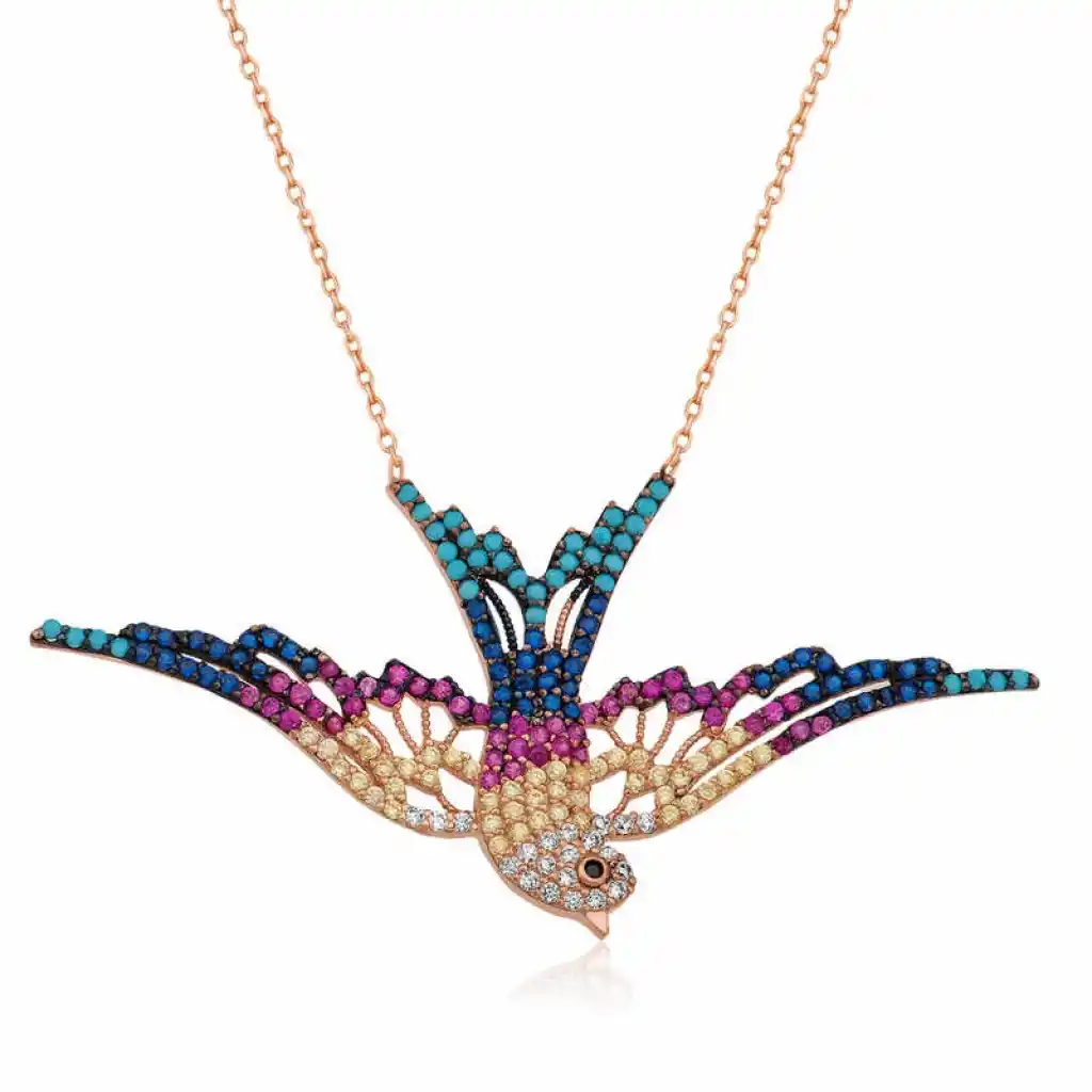 Güzelliğiyle, yıllar boyu gerek şairlerin gerekse âşıkların diline pelesenk olan kuşlardan biri olan kırlangıç, üzerinde taşıdığı anlamlarıyla da âşıkların övgüsünü hak etmektedir. Kırlangıç kuşunun özellikle aşıklar tarafından tercih edilmesinin sebebi ise tek eşli bir kuş olmasıdır. Aynı zamanda sadakati ve ailesel öğeleri de barındıran kırlangıç figürü; özgürlüğün simgesi olarak da nitelendirilebilmektedir. Sizler de sevdiklerinize aşkın sembolü olan kırlangıç bayan kolye modelini armağan edebilir, bu sayede onları mutlu edebilirsiniz. Renkli taşlı bayan kolye 925 ayar gümüşten imal edilmiştir. Kolye üzerine rose altın kaplama yapılmıştır. Rose altın kaplama yapılan gümüş bayan kolyeler parlaklığını uzun süre muhafaza eder, oksitlenmesi gecikir. Gümüş olan zincir boyu ortalama 45 cm"dir. Üzerinde bulunan taşlar zirkondur. Tüm gümüş bayan kolye modellerinde olduğu gibi gümüş kırlangıç bayan kolye modeli de el emeği ile üretilmiştir. Gümüş ve değerli taşlar nedeniyle belirtilen ortalama ürün ağırlığında ± %10 sapma olabilmektedir.