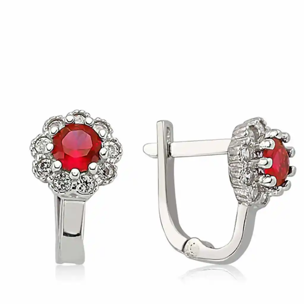 Gümüş Kırmızı Çiçek Desenli Yuvarlak J Kadın Küpe
