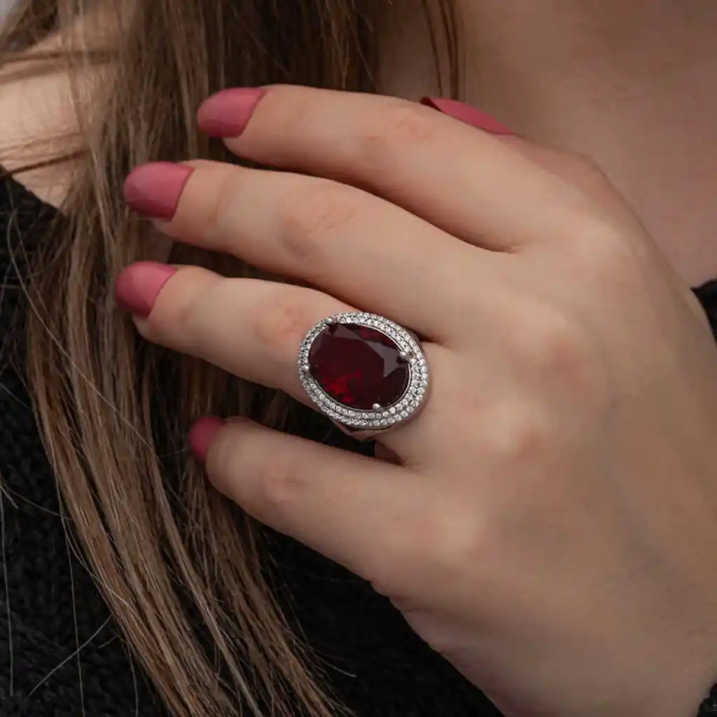 Gümüş Kırmızı Oval Taşlı Kadın Yüzük