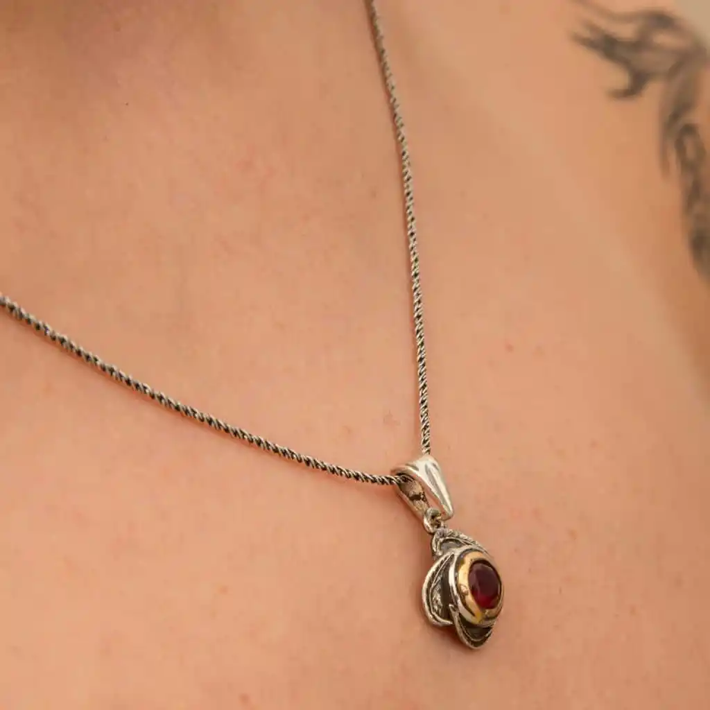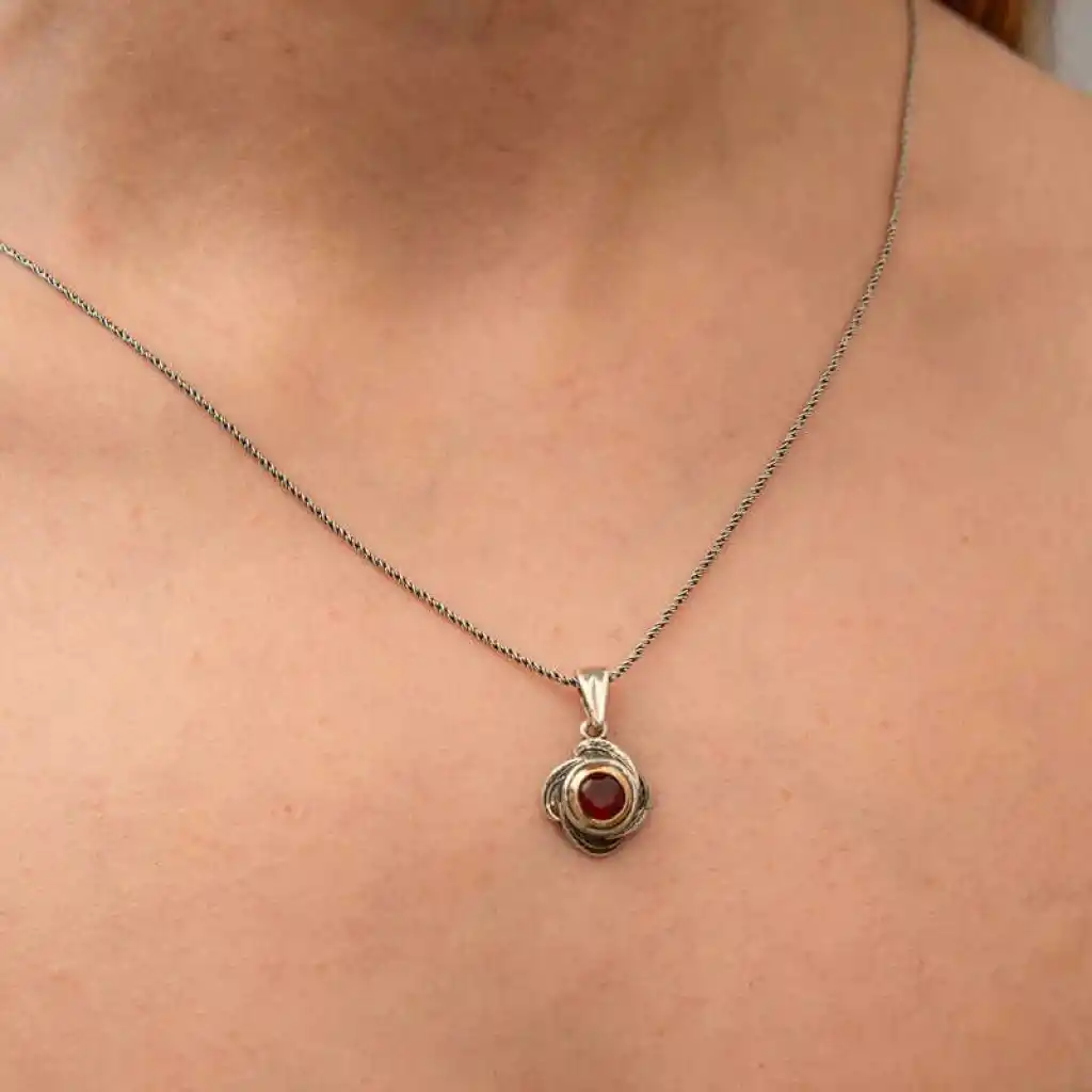 Gümüş Kırmızı Taşlı Gül Model Kadın Kolye