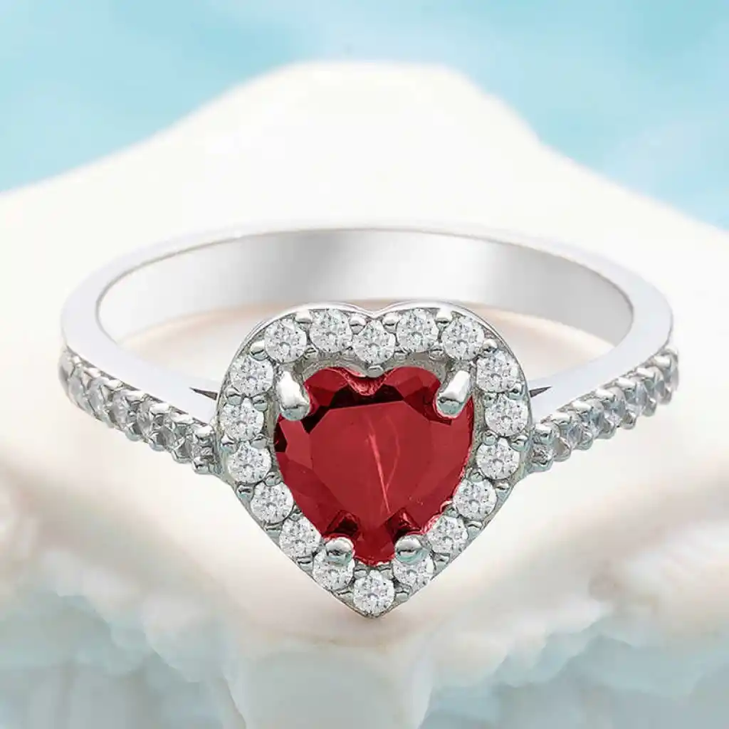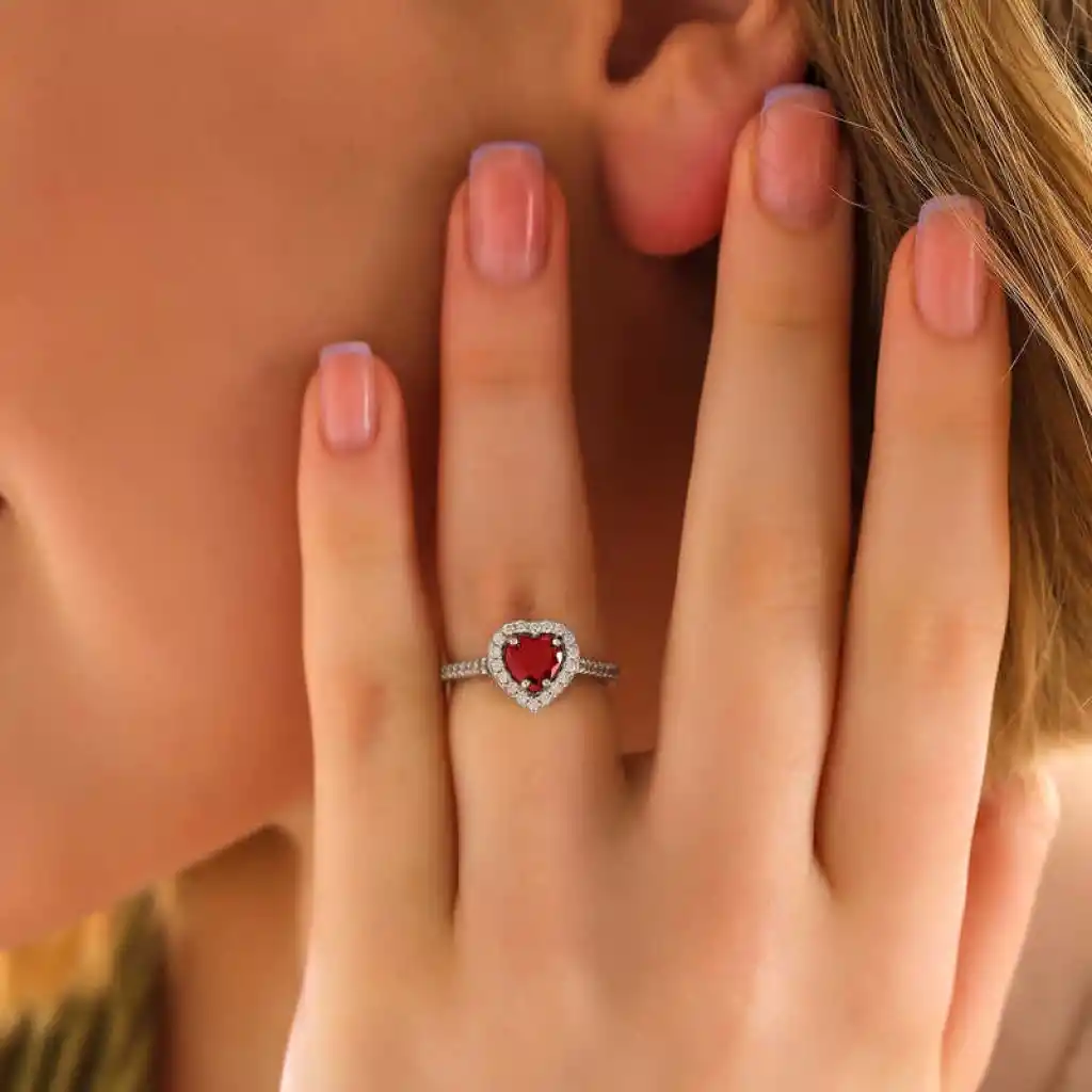 Gümüş Kırmızı Taşlı Kalpli Kadın Yüzük