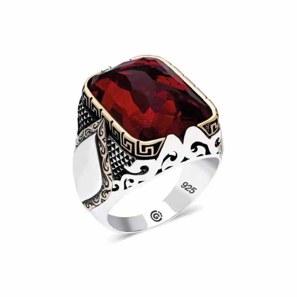 Gümüş Kırmızı Zirkon Taşlı Kare Erkek Yüzük