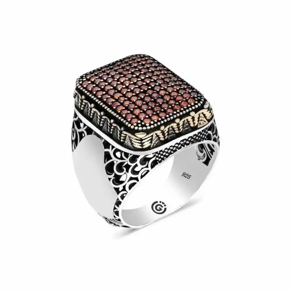 Gümüş Kırmızı Zirkon Taşlı Kare Erkek Yüzük