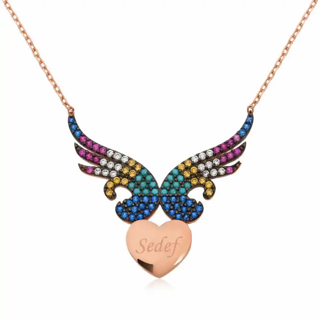 Sevdiğinizin kalbinin kanatlarınızın altında olduğunu anlatan kişiye özel kanatlı kalp kolye, duygularınızı ifade etmenizde yardımcı olacak en güzel aksesuarlardan biri olacaktır. Sevdiklerinizi sevindirebileceğiniz en anlamlı hediyelerden biri olan kanatlı kalp bayan kolye 925 ayar gümüşten imal edilmiştir. Gümüş üzerine rose altun kaplama yapılmıştır. Rose kaplama gümüşe pembe rengini vermektedir. Rose kaplama yapılan gümüş bayan kolye modelleri parlaklığını uzun süre muhafaza eder ve oksitlenmesi gecikir. Kolye üzerinde bulunan taşlar zirkondur. Gümüş olan zincir boyu ortalama 45 cm"dir. Gümüş kişiye özel kanatlı kalp bayan kolye el emeği ile üretilmiştir. Gümüş ve değerli taşlar nedeniyle belirtilen ürün ağırlığında ± %10 sapma olabilmektedir. Not : Yazdırmak istediğiniz ismi not kısmında belirtiniz, isim yazılan ürünlerde iade kabul edilememektedir.