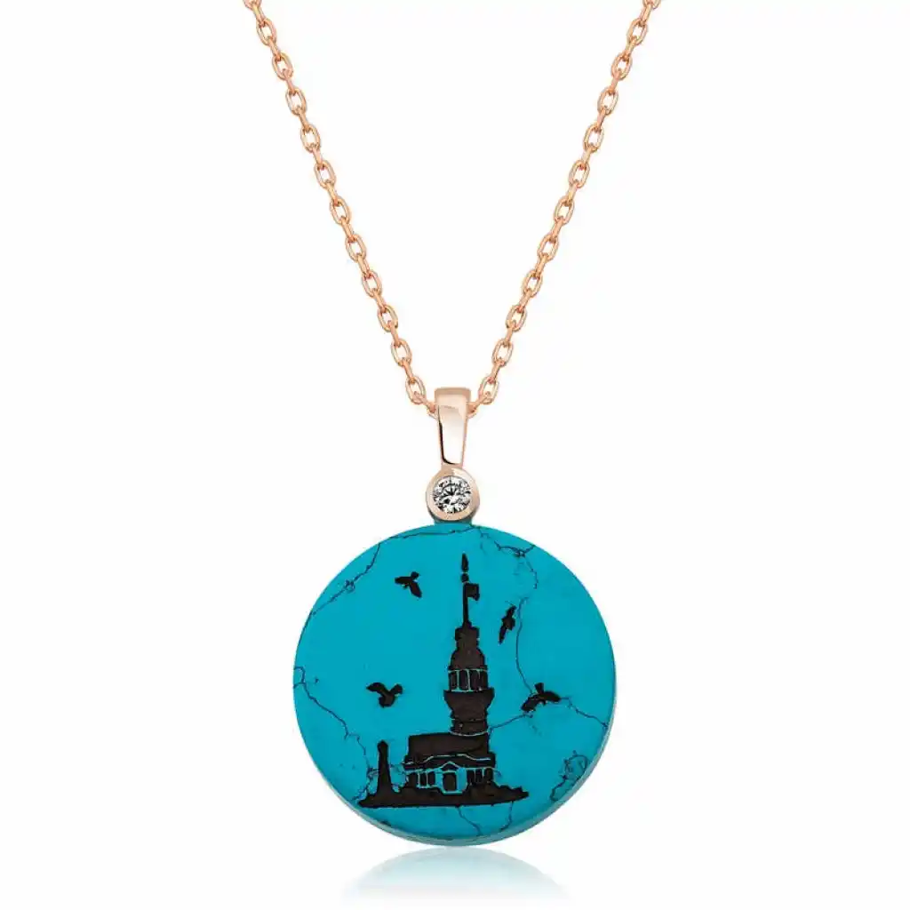 Kız Kulesi Tarih sahnesinde birçok efsaneye konu olmuş değişik bir yapıdır. Bu efsanelerin en bilineni ise bir kral rüya görür. Rüyasında krala, kızı için 18 yaşına girdiğinde kızının öleceği söylenmiştir. Bu ölümün sebebi ise bir yılanın onu sokmasıdır. Rüyayı o günün tabircilerine tabir ettirdiğinde rüyanın aynen gerçekleşeceğini öğrenir. Rivayete göre kral bu duruma çok üzülür ve denizin ortasına bir kule inşa ettirmeye karar verir. Yapımı tamamlanan kuleye kızını kapattırmak zorunda kalır. Kral bununla da kalmayıp kule içine yılan girmemesi için bir çok önlem alır. Gün gelir kralın kızı hastalanır. Yataklara düşer ve ateşlenir. Ancak ne hikmetse hiç bir hekim bir çare bulamaz. En son bir hekim kralın kızını iyileştirir ve kral tarafından o gün bayram ilan edilir. Her yerde şenlik ve eğlence devam ederken kuleye bir sepet üzüm gönderilir. Sepetin içinde ki yılan kralın kızını sokar ve söylenenlerin çıkması kralı derin bir kedere sürükler. Kral kızına Ayasofya üzerine bir tabut yaptırır. Rivayet odur ki yılan kızı hala rahatsız etmektedir. Efsanelere konu olmuş kız kulesi manzarası şimdi de Firuze taşının üzerine kazınmış gümüş kolye olarak tasarlanmıştır. Zincir 925 ayar gümüşten imal edilmiştir, üzerine rose altın kaplama yapılmıştır. Zincir uzunluğu ortalama 45 cm’dir. Gümüş kolye modellerimizin tamamı el emeği ile üretilmiştir. Gümüş ve değerli taşlar nedeniyle belirtilen ortalama ürün ağırlığında ± %10 sapma olabilmektedir.