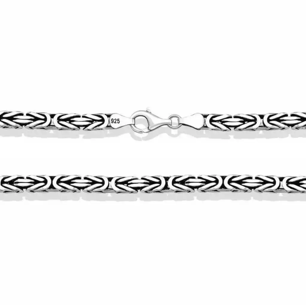 Gümüş zincir modelleri, gümüş takılar içerisinde hiç kuşkusuz en çok tercih edilen ürün gruplarından birisidir. Gümüş zincir modelleri içerisinde de kral zincirler yıllarca çok sevilenler arasında hep üst sıralardaki yerini korumuştur. Kral zincir modelleri gerek fiyatları gerek kalitesi bakımından erkek takı sevenlerin hem boyunlarını, hem de bileklerini süslemiştir. Gümüş kral zincir modellerini genellikle erkekler tercih eder. Bu nedenle babalar günü hediyesi veya sevgililer günü hediyesi almak isteyen hanımların gözde tercihidir. İster kolye uçları ile birlikte, isterseniz de sade zincir şeklinde kullanabilirsiniz. Bu kral zincir modeli 925 ayar gümüşten imal edilmiştir. Tamamen el emeği ile kolye haline getirilmektedir. Gümüş zincir üzerine parlaklığı uzun süre koruması için ayrıca gümüş kaplama da yapılmıştır. İsteğe göre özel siparişle farklı boy ve gramlarda da imal edilebilir. Tüm gümüş zincir modellerinde olduğu gibi 925 ayar gümüş köşeli kral zincir modeli de tamamen el emeği ile üretildiği için belirtilen ortalama ürün ağırlığında ± %10 fark olabilir.
