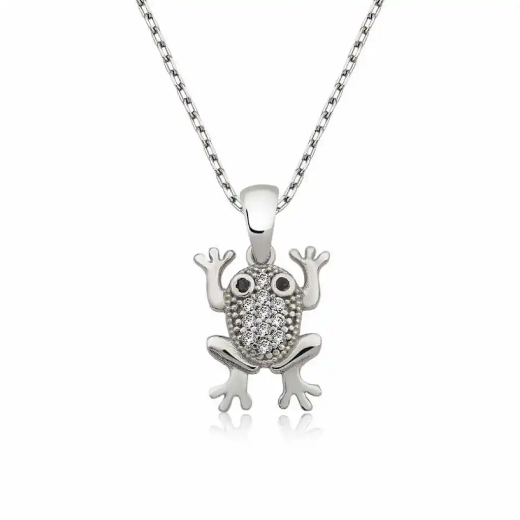 Ruh hayvanı ya da ongun olarak kurbağa bize, hayatlarımızın geçici doğasını anımsatır. Kurbağa yaşam dönemlerini, özellikle yeniden doğuş evresini simgelemektedir. Kurbağa tasarımlı bu şık kolyeyi; doğum günü hediyesi, sevgililer günü hediyesi veya annelere hediye olarak özel günlerde tercih edebilirsiniz. Kolye 925 ayar gümüşten imal edilmiştir. Gümüş kolye üzerine rodyum kaplama yapılmıştır. Rodyum kaplama yapılan bayan kolyeler parlaklığını uzun süre muhafaza eder, oksitlenmeyi geciktirir. Kolye üzerinde bulunan taşlar zirkondur. Tüm gümüş bayan kolyelerinde olduğu gibi bu gümüş kurbağa bayan kolye de tamamı el emeği ile üretilmiştir. Gümüş ve değerli taşlar nedeniyle belirtilen ortalama ürün ağırlığında ± %10 sapma olabilmektedir.