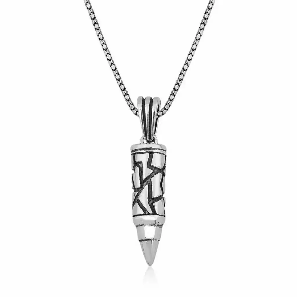 Siz de trendlerin gerisinde kalmaktan hoşlanmıyorsanız Kurşun Kolye sizin için doğru bir seçim olacaktır. Tarihimizden arda kalan en önemli savaş aletlerinden olan kurşun mistik havasıyla sizler için tasarlandı. Bu şık kolye; doğum günü hediyesi, babalar günü veya özel günlerde tercih edilebilecek mükemmel bir seçenektir. Kolye; 925 ayar gümüşten imal edilmiştir. Gümüş eskitme desen ve üzerine oksit kaplama yapılmıştır. Diğer kolyelerde olduğu gibi gümüş kurşun erkek kolye de el emeği ile üretilmiştir. Gümüş ve değerli taşlar nedeniyle belirtilen ortalama ürün ağırlığında ± %10 sapma olabilmektedir.