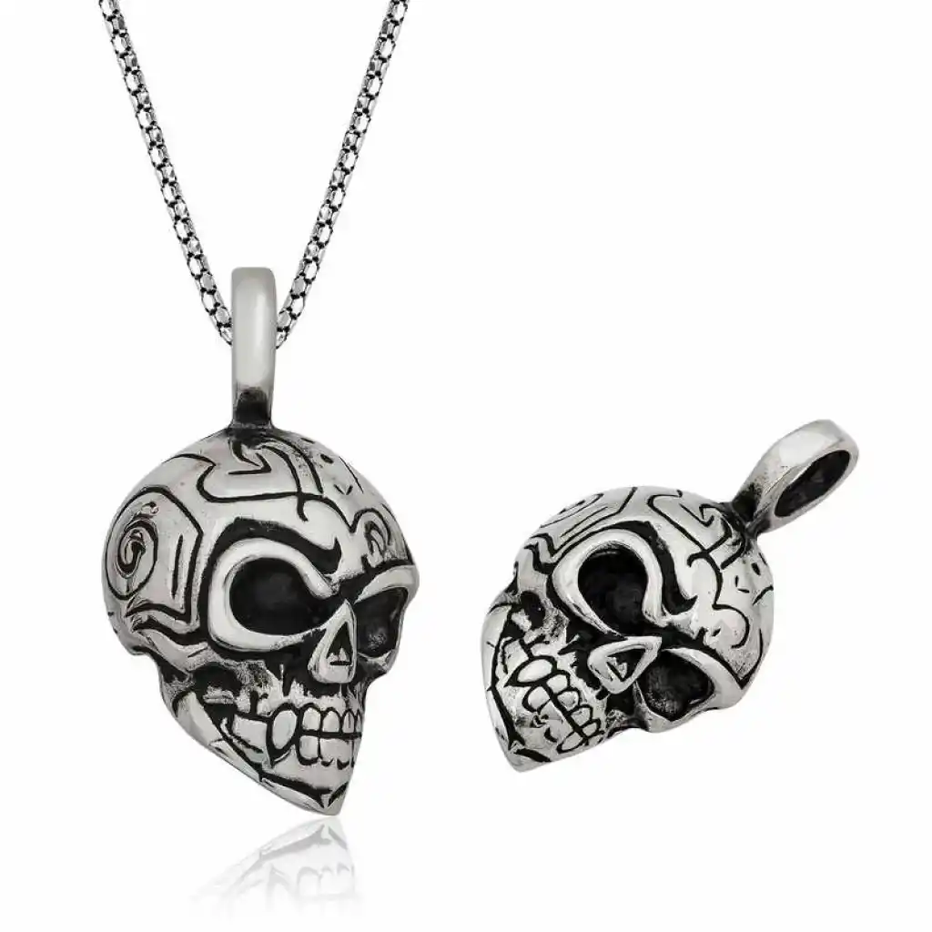 Kuru kafanın gizem ve ölüm anlamı vardır. Takılarda sıklıkla kullanılır. Bu şık kolye modelinin de esin kaynağı olmuştur. Kuru kafa erkek kolye modeli 925 ayar gümüşten imal edilmiştir. Kolye üzerine oksit kaplama yapılmıştır. Oksit kaplama yapılan gümüş takılar eskitme bir görünüme kavuşur. Tüm gümüş kolye modellerinde olduğu gibi gümüş kuru kafa erkek kolye modeli de tamamen el emeği ile üretilmiştir. Gümüş zincir uzunluğu 55 cm"dir. Gümüş ve değerli taşlar nedeniyle belirtilen ortalama ürün ağırlığında ± %10 sapma olabilmektedir.