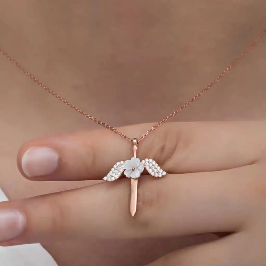 Melekler saflığın ve temizliğin simgeleridir. Bu nedenle melek kolye hediye edilen kişiye melek kadar saf ve temiz olduğu mesajı verilmektedir... Aşkınızı meleklerin koruması için tasarlanan bu özel manolya çiçeği melek kadın kolyeyi sevgilinize; doğum günü, sevgililer günü ve özel günlerde hediye ederek onları mutlu edebilirsiniz. Kolye; 925 ayar gümüşten imal edilmiştir. Gümüş melek kadın kolye üzerine rodyum kaplama yapılmıştır. Rodyum kaplama yapılan tüm kolyeler parlaklığını uzun süre muhafaza eder, gümüşe pembe rengi verir. Tüm gümüş kolyelerde olduğu gibi bu gümüş manolya çiçeği melek kadın kolye de el emeği ile üretilmiştir. Gümüş ve değerli taşlar nedeniyle ürün ağırlığında ± %10 sapma olabilmektedir.