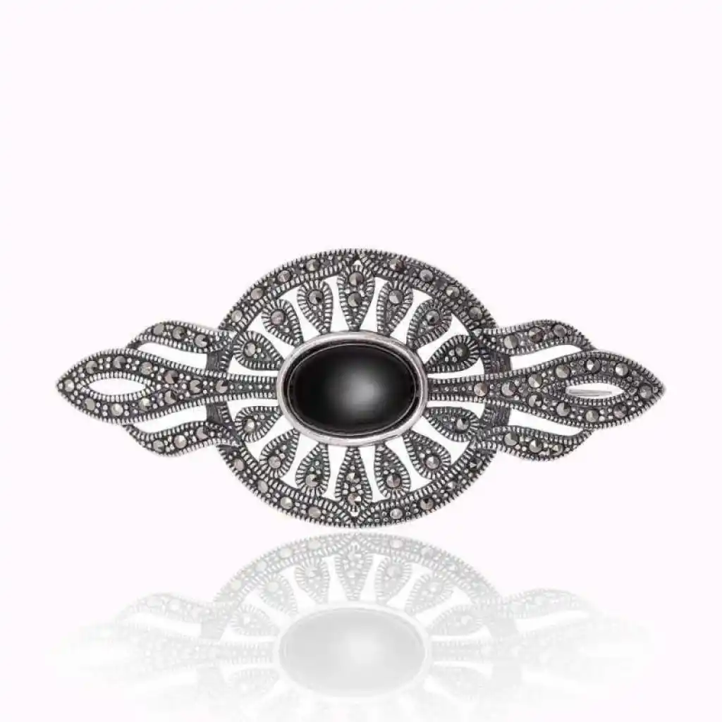 Gümüş Markazit ve Oniks Taşlı Broş