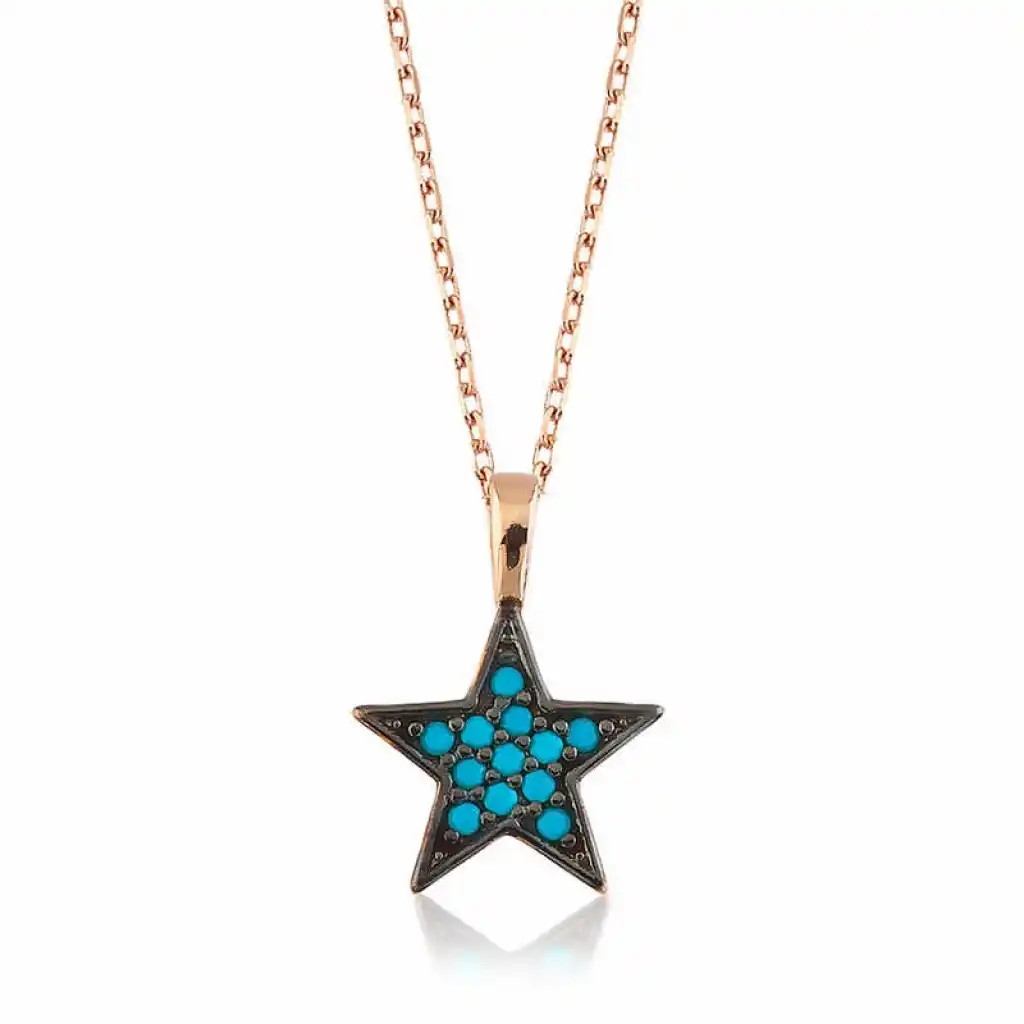 Gecenin parlak ışıltısını anımsatan yıldız, sembolik olarak evrenin sonsuzluğunu, uzaktaki bir noktayı ifade eder. Parıltının, ışığın, aydınlığın ve umudun sembolüdür. Her insan özel, her sevilen eşsizdir. Eşsiz sevginin ömür boyu sürecek birlikteliğin simgesi mavi yıldız bayan kolye ile sevdiklerinizi mutlu etmeye ne dersiniz. Kolye 925 ayar gümüşten imal edilmiştir. Gümüş üzerine rose kaplama yapılmıştır. Rose kaplama yapılan ürünler parlaklığını uzun süre muhafaza eder, gümüş rengini pembe renge dönüştürür ve oksitlenmeyi geciktirir. Kolye üzerinde bulunan taşlar firuzedir. Gümüş bayan kolye modellerinin tamamında olduğu gibi gümüş mavi yıldız bayan kolye de modeli de el emeği ile üretilmiştir. Gümüş ve değerli taşlar nedeniyle belirtilen ortalama ürün ağırlığında ± %10 sapma olabilmektedir.