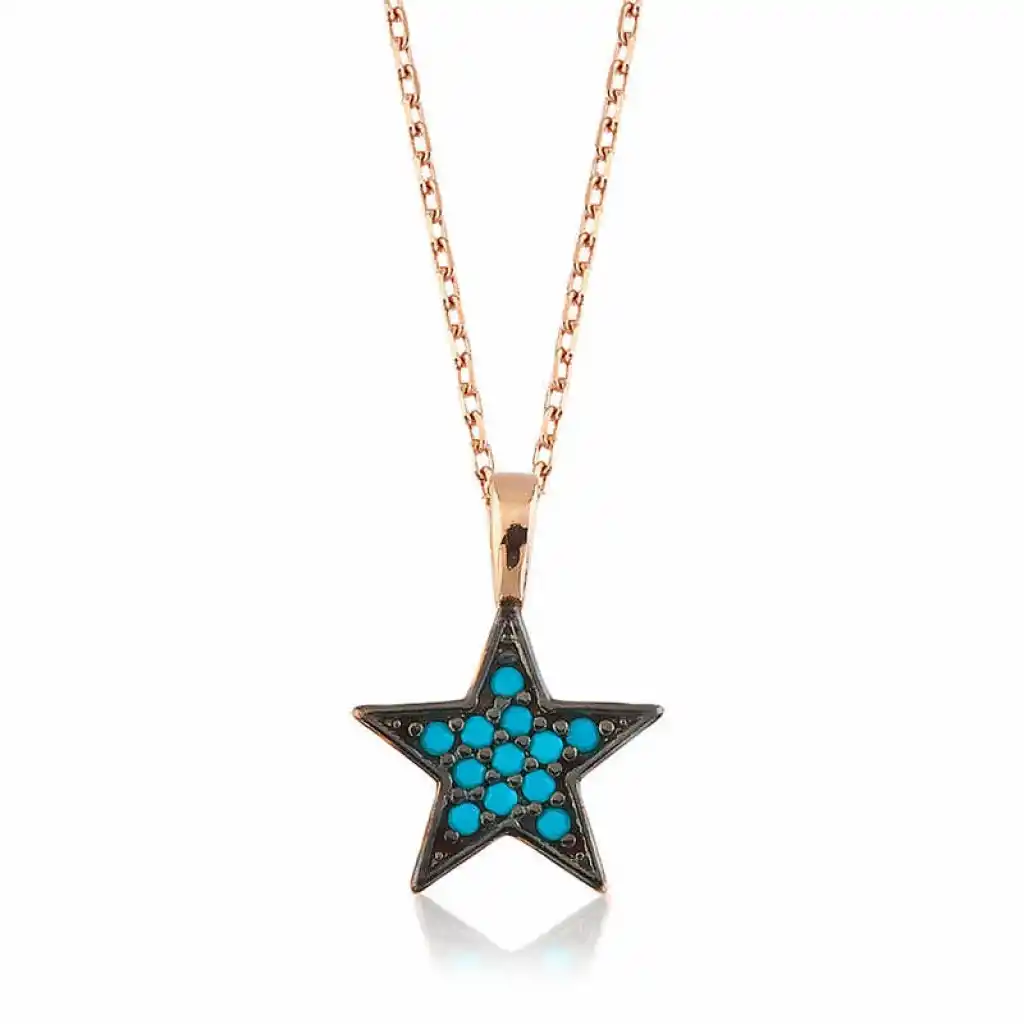 Gecenin parlak ışıltısını anımsatan yıldız, sembolik olarak evrenin sonsuzluğunu, uzaktaki bir noktayı ifade eder. Parıltının, ışığın, aydınlığın ve umudun sembolüdür. Her insan özel, her sevilen eşsizdir. Eşsiz sevginin ömür boyu sürecek birlikteliğin simgesi mavi yıldız bayan kolye ile sevdiklerinizi mutlu etmeye ne dersiniz. Kolye 925 ayar gümüşten imal edilmiştir. Gümüş üzerine rose kaplama yapılmıştır. Rose kaplama yapılan ürünler parlaklığını uzun süre muhafaza eder, gümüş rengini pembe renge dönüştürür ve oksitlenmeyi geciktirir. Kolye üzerinde bulunan taşlar firuzedir. Gümüş bayan kolye modellerinin tamamında olduğu gibi gümüş mavi yıldız bayan kolye de modeli de el emeği ile üretilmiştir. Gümüş ve değerli taşlar nedeniyle belirtilen ortalama ürün ağırlığında ± %10 sapma olabilmektedir.