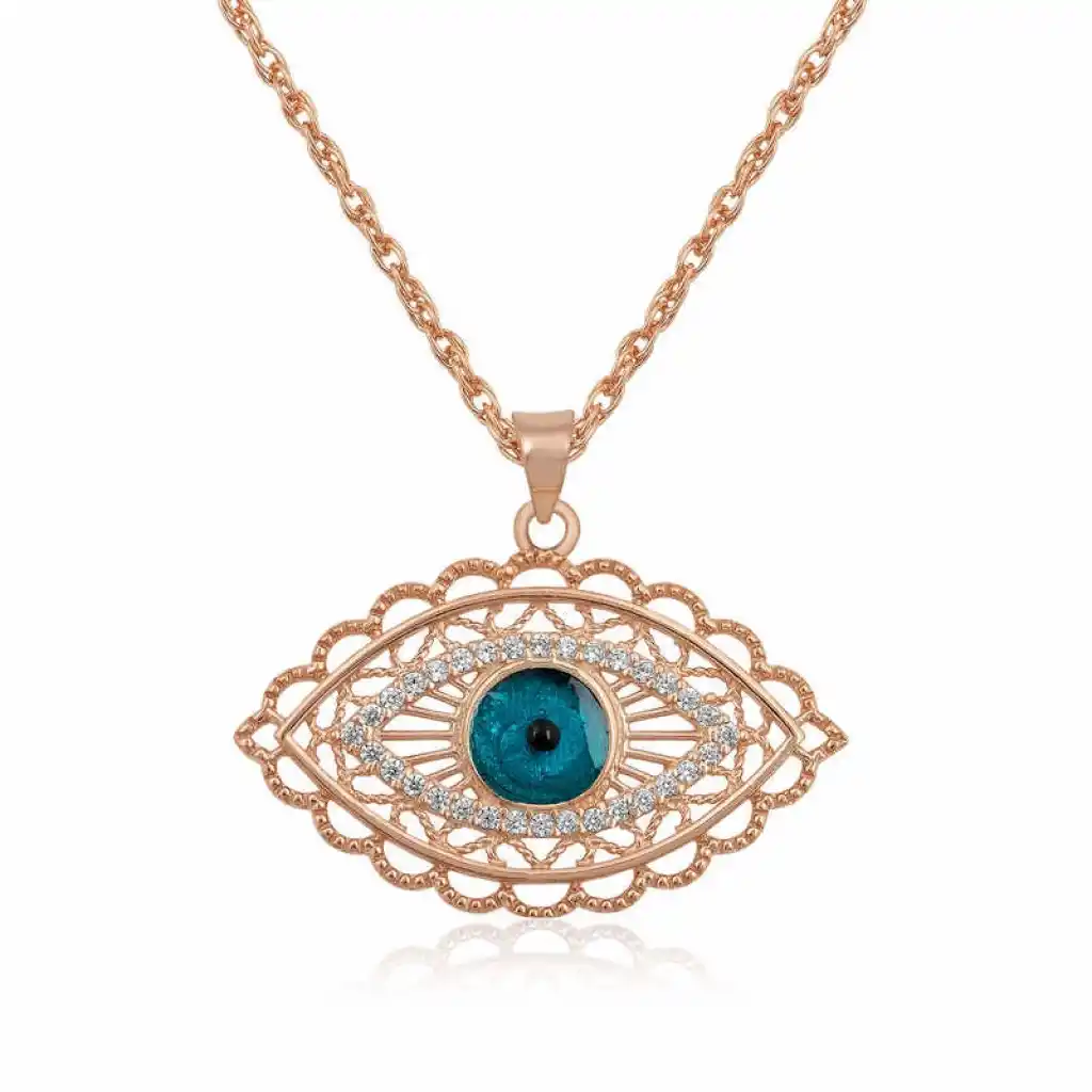 Günün her anında size eşlik edecek ve kombinlerinizi tamamlayabileceğiniz mekik nazarlı gümüş kolye, şıklığınıza şıklık katacak bir aksesuar olacak. Bu şık kolye; doğum günü hediyesi, sevgililer günü veya özel günlerde tercih edilebilecek mükemmel bir seçenektir. Kolye; 925 ayar gümüşten imal edilmiştir. Üzerindeki taşlar zirkondur. Gümüş üzerine rose altın kaplama yapılmıştır. Rose altın kaplama yapılan ürünler gümüşe pembe bakır rengi verir. Diğer kolyelerde olduğu gibi gümüş mekik nazar kolye de el emeği ile üretilmiştir. Gümüş ve değerli taşlar nedeniyle belirtilen ortalama ürün ağırlığında ± %10 sapma olabilmektedir.