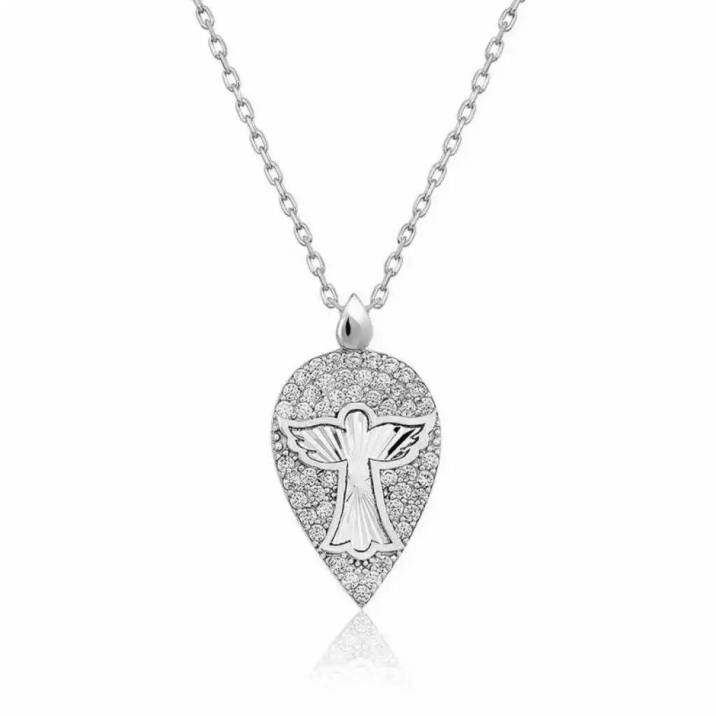 Takıda en çok tercih edilen formlardan biri olan melek sembolleri, en güzel dilekleri, şansı, iyiliği ve ümit etmeyi ifade ediyor. Şifadan bilgeliğe, sevgiden berekete pek çok dileği sembolize eden melek damla bayan kolye modelleri, gerek görünümlerindeki şıklık, gerekse taşıdıkları anlam ile size ve sevdiklerinize şans getirecek. Kolye, 925 ayar gümüşten imal edilmiştir. Gümüş üzerine rodyum kaplama yapılmıştır. Rodyum kaplama yapılan gümüş kolye modelleri parlaklığını uzun süre muhafaza eder ve oksitlenmesi gecikir. Zincir boyu ortalama 45 cm"dir. Tüm gümüş bayan kolyelerde olduğu gibi bu gümüş melek damla bayan kolye modelinin de tamamı el emeği ile üretilmiştir. Gümüş ve değerli taşlar nedeniyle belirtilen ortalama ürün ağırlığında ± %10 sapma olabilmektedir.