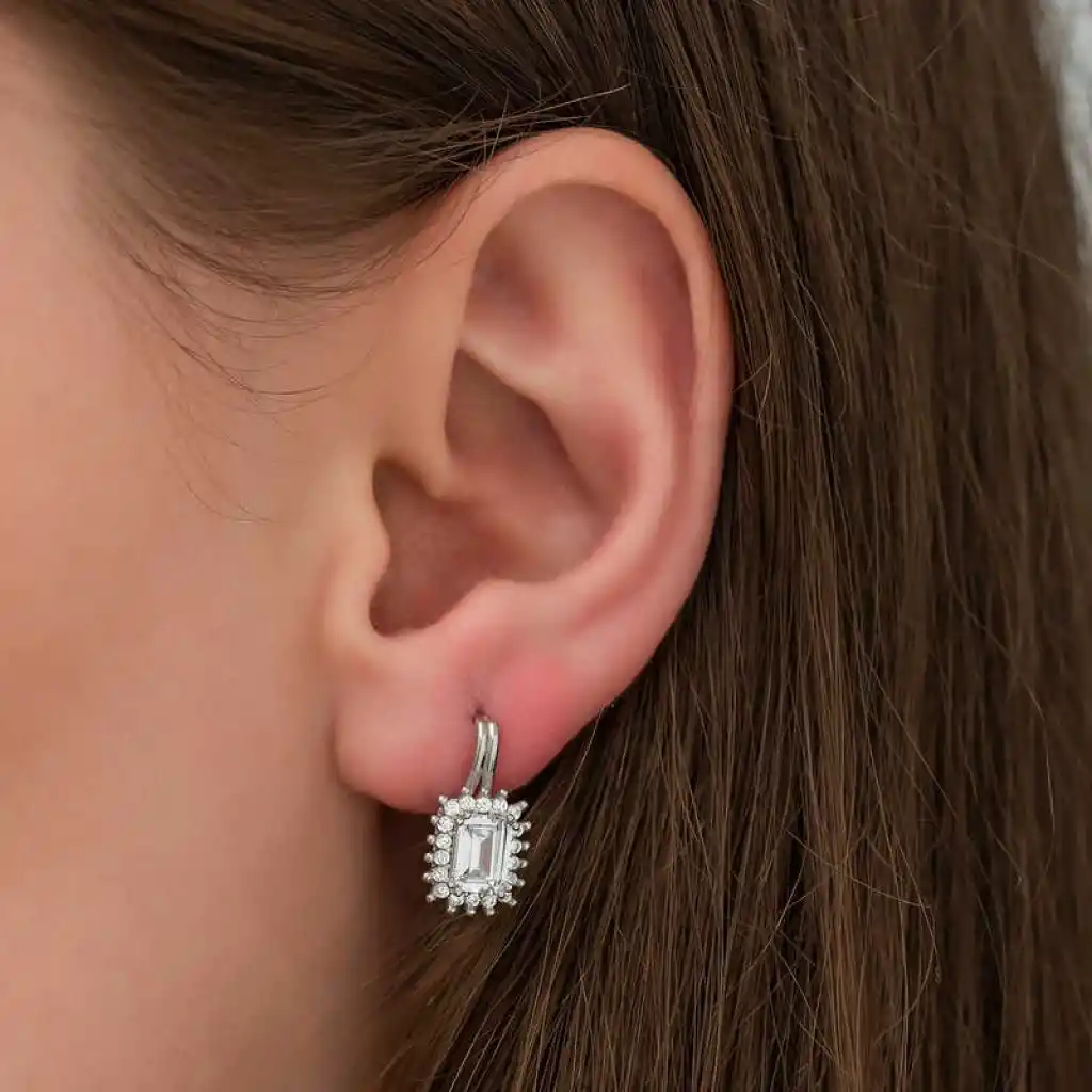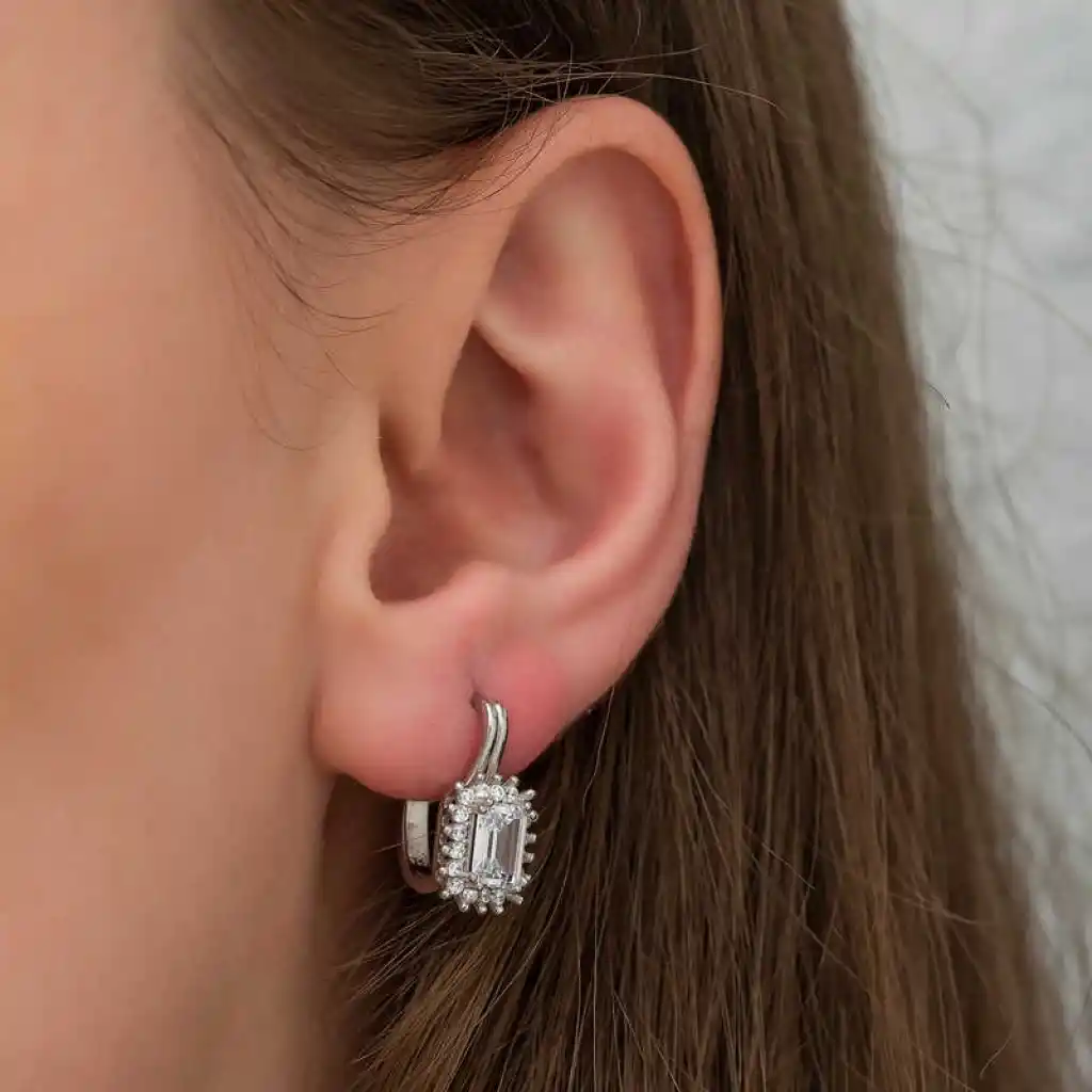 Gümüş rodyum kaplama mengeçli zümrüt kesim küpe, günün her anında severek kullanılabilecek spor ve klasik her konsepte uyum sağlayan aksesuarlardandır. Mengeçli zümrüt kesim bayan küpe 925 ayar gümüşten imal edilmiştir. Gümüş üzerine rodyum kaplama yapılmıştır. Rodyum kaplama yapılan gümüş mengeçli zümrüt kesim küpe modelleri parlaklığını uzun süre muhafaza eder, oksitlenmesi gecikir. Üzerinde bulunan taşlar zirkondur. Gümüş küpe modellerinin tamamında olduğu gibi gümüş mengeçli zümrüt kesim bayan küpe modeli de el emeği ile üretilmiştir. Gümüş ve değerli taşlar nedeniyle belirtilen ortalama ürün ağırlığında ± %10 sapma olabilmektedir.