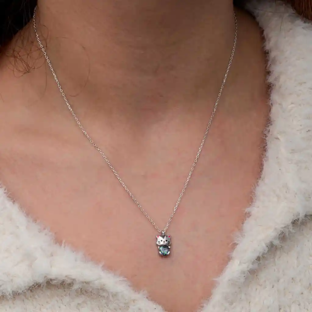 Kediler, bağımsızlıklarıyla bilinir. Bu nedenle, kedi kolyeleri özgür ruhları simgeler ve takanın kendine olan güvenini vurgular.Evlerimizin sevimli neşe kaynağı kediler, temiz olmalarının yanı sıra masumiyetin simgesidir. Asil ve mantıklı bir kişiliğe, mükemmel sezgilere ve akılcı bir duyarlılığa sahiptirler. Bu şık kolye; doğum günü hediyesi, sevgililer günü veya özel günlerde tercih edilebilecek mükemmel bir seçenektir. Kolye; 925 ayar gümüşten imal edilmiştir. Gümüş üzerine rodyum kaplama yapılmıştır. Gümüş ve değerli taşlar nedeniyle belirtilen ortalama ürün ağırlığında ± %10 sapma olabilmektedir.