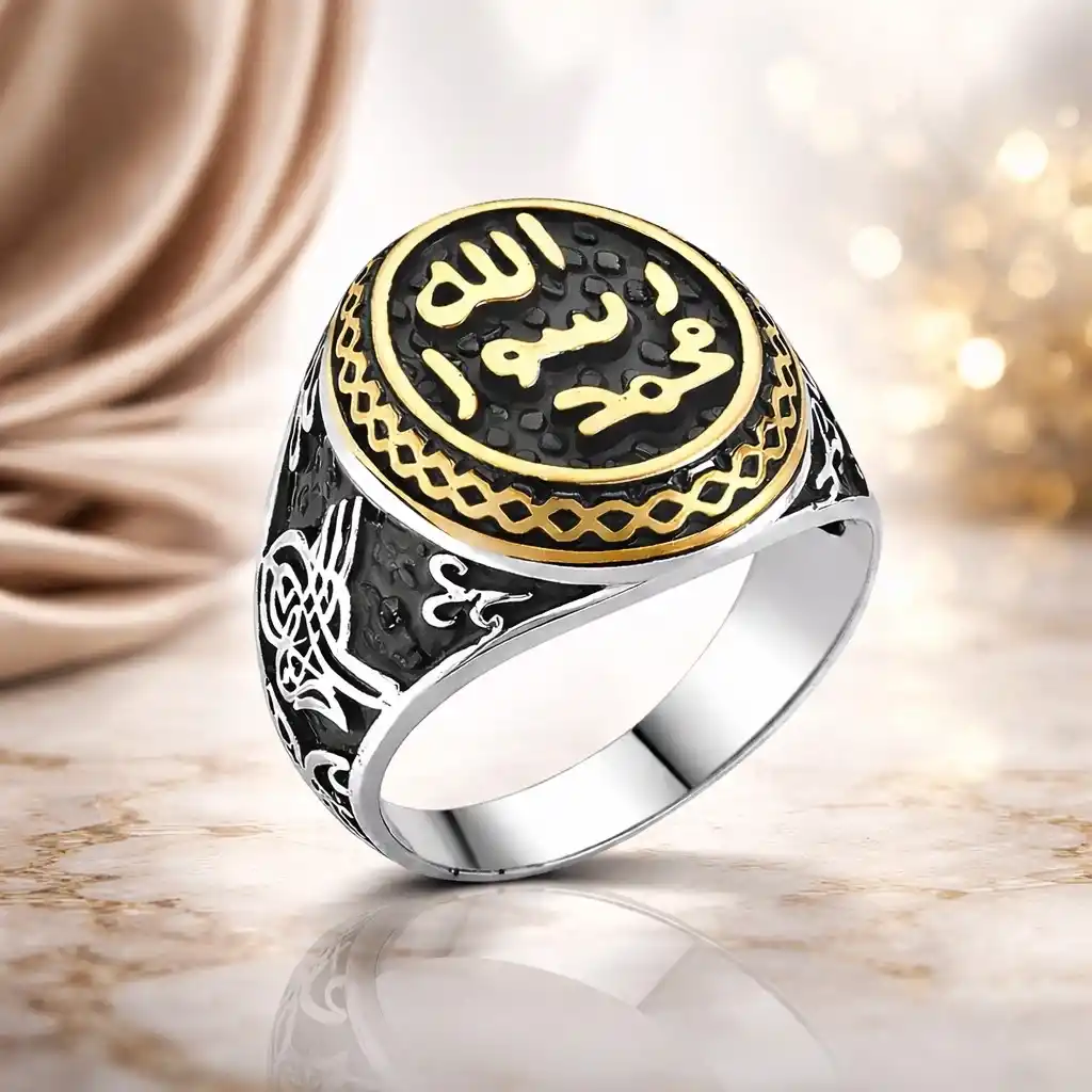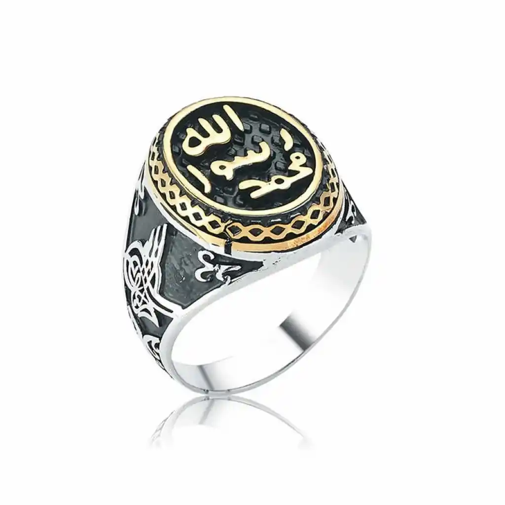 Allah Resulü Muhammed Yazılı Mühr-ü Şerif Gümüş Yüzük. Efendimizin (s.a.v.) mührü, Topkapı Sarayı"nda bulunmaktadır. Mühür olarak Türkçeleştirdiğimiz ifâdenin aslı "hâtem" dir. Hatem yüzük mânâsında da kullanılır. Nitekim Resulullah"ın mührü aynı zamanda yüzük şeklindeydi. "Hâtemu"n-Nebî" veya "Hatemü Resûlillah" diye tabir edilen bu yüzük gümüşten yapılmıştı ve kaşlı idi. (Buhari ) Enes b. Malik (ra) anlatıyor, Peygamberimizin Mührü gümüşten yapılmıştı. Kaşı ise Habeş taşındandı. Efendimiz yabancı devlet reislerine mektup yazmak isteyince, bir mühür yüzük yapılmasını buyurdu. Peygamber Efendimizin parmağındaki yüzüğün parıltısı hala gözümün önünde duruyor. Peygamber Efendimizin Mühr-ü Şeriflerinin taşına, üç satır halinde, Muhammed Resulullah" ibaresi kazınmıştı. Birinci satırda “Muhammed”, ikinci satırda “Resul”, üçüncü satırda da “Allah” kelimeleri yer almaktadır. 925 ayar gümüşten imal edilmiştir. Gümüş üzerine oksit kaplama yapılmıştır. Oksit kaplama yapılan erkek yüzükleri parlaklığını uzun süre muhafaza eder, oksitlenmesi gecikir. Ürünlerimizin tamamı el emeği ile üretilmiştir. Gümüş ve değerli taşlar nedeniyle belirtilen ortalama ürün ağırlığında ± %10 sapma olabilmektedir.