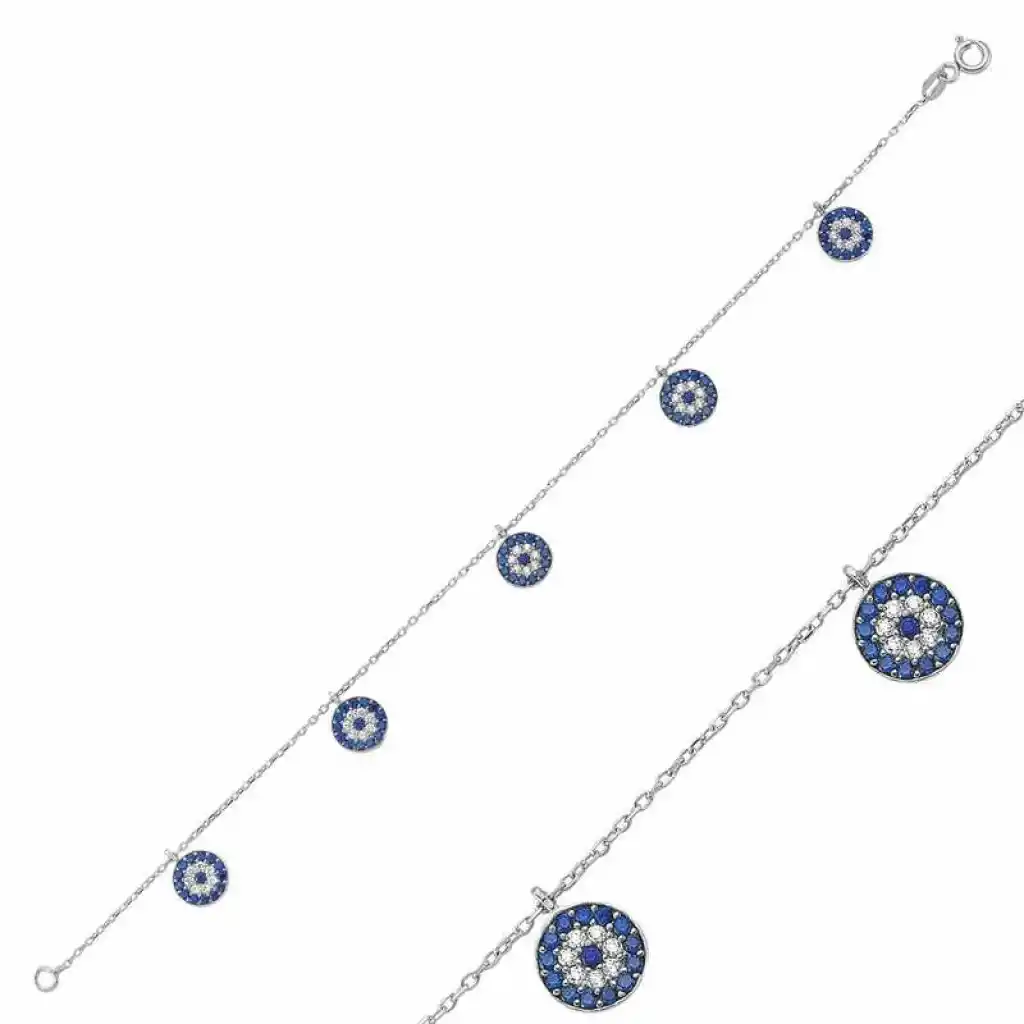 Nazar boncuğunu insanlar uzun yıllardan beri kötü bakıştan korunmak için kullanmışlardır. Kötü bakışların insanlar üzerinde olumsuz etki oluşturmasına karşı bir önlemdir nazar boncuğu… Bu sebeptendir ki insanlar sevdiklerini korumak için nazar boncuğu takmaktadır. Bu nazar bileklik de şıklığı ve zarafeti yansıtıyor. Her dönem sevilen ve şıklığından ödün vermeyen bu modeli; doğum günü hediyesi, sevgililer günü hediyesi veya annelere hediye olarak özel günlerde tercih edebilirsiniz. Gümüş nazar bayan bileklik, 925 ayar gümüşten imal edilmiştir. Gümüş üzerine rodyum kaplama yapılmıştır. Rodyum kaplama yapılan gümüş bayan bileklikler parlaklığını uzun süre muhafaza eder, oksitlenmesi gecikir. Üzerinde bulunan taşlar zirkondur. Tüm gümüş bayan bilekliklerinde olduğu gibi bu gümüş nazar bayan bileklik modeli de tamamı el emeği ile üretilmiştir. Gümüş ve değerli taşlar nedeniyle belirtilen ortalama ürün ağırlığında ± %10 sapma olabilmektedir.