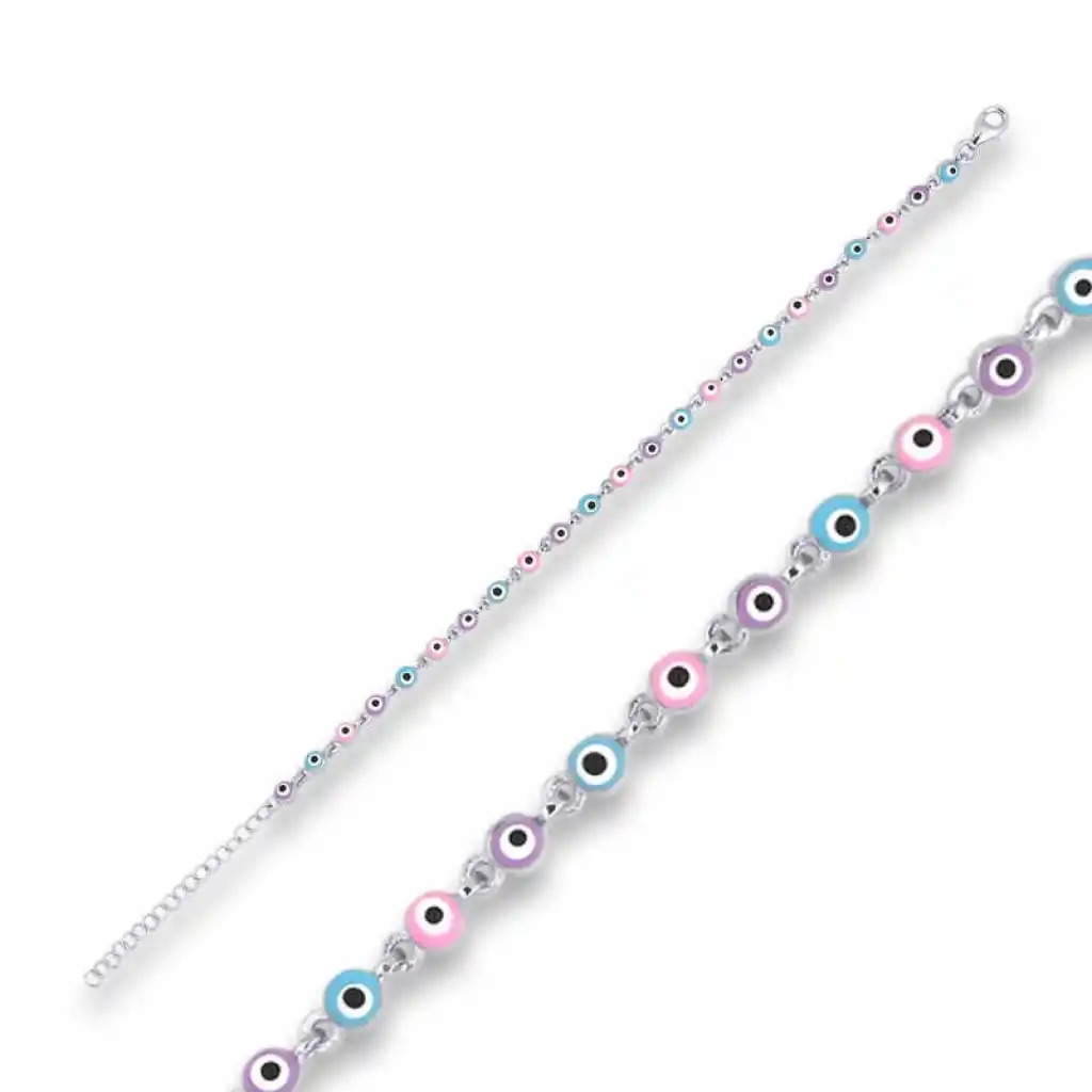 Nazar boncuğunu insanlar uzun yıllardan beri kötü bakıştan korunmak için kullanmışlardır. Kötü bakışların insanlar üzerinde olumsuz etki oluşturmasına karşı bir önlemdir, nazar boncuğu… Bu sebeptendir ki insanlar sevdiklerini korumak için nazar boncuğu takmaktadır. Bu nazar boncuklu bileklik de şıklığı ve zarafeti yansıtıyor. Her dönem sevilen ve şıklığından ödün vermeyen bu modeli; doğum günü hediyesi, sevgililer günü hediyesi veya annelere hediye olarak özel günlerde tercih edebilirsiniz. Gümüş nazar bayan bileklik, 925 ayar gümüşten imal edilmiştir. Gümüş üzerine rodyum kaplama yapılmıştır. Rodyum kaplama yapılan gümüş bayan bileklikler parlaklığını uzun süre muhafaza eder, oksitlenmesi gecikir. Üzerinde bulunan taşlar zirkondur. Tüm gümüş bayan bilekliklerinde olduğu gibi bu gümüş nazar boncuklu bayan bileklik modeli de tamamı el emeği ile üretilmiştir. Gümüş ve değerli taşlar nedeniyle belirtilen ortalama ürün ağırlığında ± %10 sapma olabilmektedir.