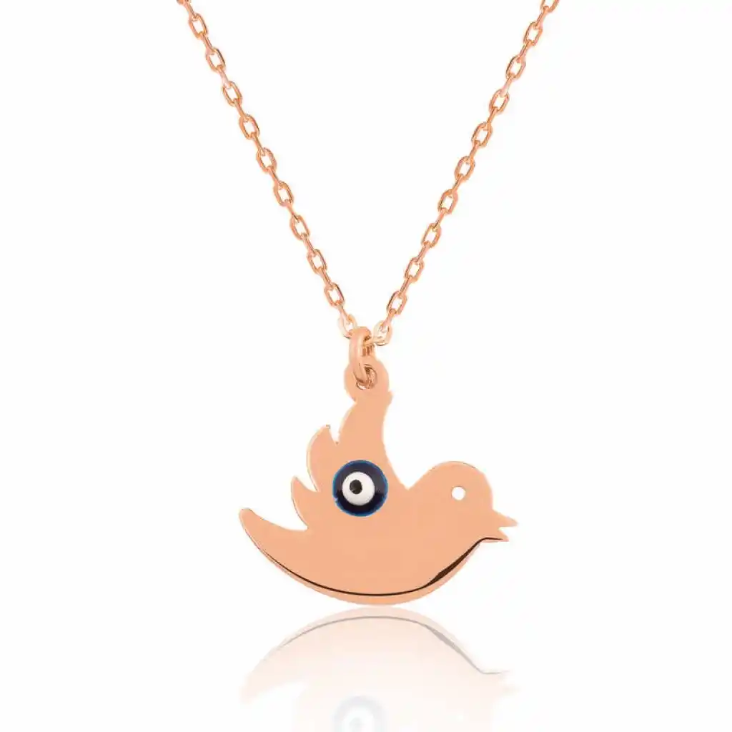 Kuş pek çok kültürde aşk, başarı, kariyer, iyi talihin, bolluğun ifadesi olduğu bilinmektedir... Bu mistik havadan esinlenerek tasarlanan bu kolye ile daima iyi şansın sizinle olmasına ne dersiniz? Bu şık ve anlamlı kolyeyi doğum günü hediyesi, sevgililer günü hediyesi veya annelere hediye olarak özel günlerde tercih edilebilecek mükemmel bir seçenektir. Nazarlı kuş bayan kolye 925 ayar gümüşten imal edilmiştir. Gümüş üzerine rose kaplama yapılmıştır. Rose kaplama yapılan bayan kolyeler parlaklığını uzun süre muhafaza eder, gümüş rengini pembe renge dönüştürür ve oksitlenmeyi geciktirir. Zincir boyu ortalama 45 cm"dir. Tüm bayan kolyelerimizde olduğu gibi gümüş nazarlı kuş bayan kolye de tamamı el emeği ile üretilmiştir. Gümüş ve değerli taşlar nedeniyle ürün ağırlığında ± %10 sapma olabilmektedir.