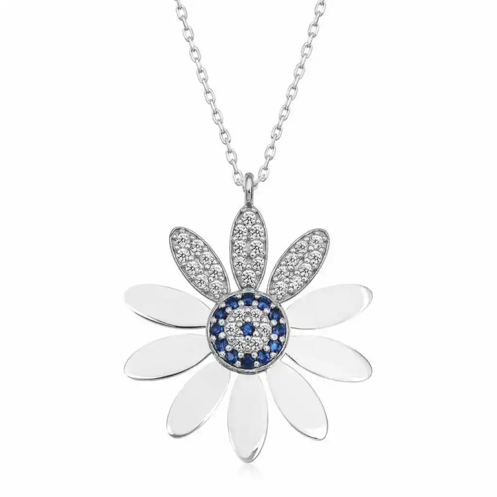 Papatya çiçeği temiz sevgi anlamını ifade eder. En büyük özelliklerinden biri her sapında bir tane olmasıdır. Bu güzellik tasarlanarak ortaya çıkan bu ışıl ışıl kolye zirkon taşlarla süslendi... Bu şık kolye; doğum günü hediyesi, sevgililer günü hediyesi veya annelere hediye olarak özel günlerde tercih edilebilecek mükemmel bir seçenektir. Gümüş nazar papatya kadın kolye 925 ayar gümüşten imal edilmiştir. Bu kolye üzerinde rodyum kaplama vardır. Rodyum kaplama yapılan ürünler parlaklığını uzun süre muhafaza eder. Üzerinde bulunan ışıl ışıl taşlar zirkondur. Tüm gümüş kadın kolye modellerinde olduğu gibi gümüş nazarlı papatya kadın kolye modeli de el emeği ile üretilmiştir. Gümüş ve değerli taşlar nedeniyle belirtilen ortalama ürün ağırlığında ± %10 sapma olabilmektedir.