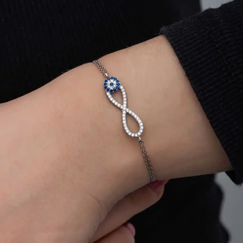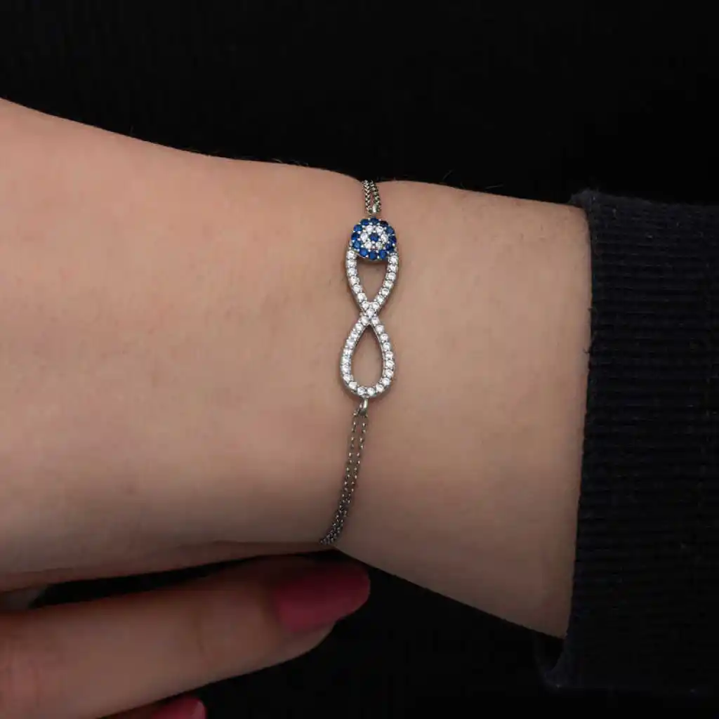 Sevdiklerinize sonsuz aşkı ifade etmenin en güzel en anlamlı yollarından biride bu nazar boncuklu sonsuzluk bilekliktir. Sevdiklerinize hediye edeceğiniz bu özel gümüş bileklik ile ona olan sonsuz sevginizi ifade edebilir sonsuza kadar birlikte olacağınız mesajı verebilirsiniz. 925 ayar gümüşten imal edilmiştir. Gümüş üzerine rodyum kaplama yapılmıştır. Rodyum kaplama yapılan kadın gümüş bileklik modelleri parlaklığını uzun süre muhafaza eder, oksitlenmesi gecikir. Tüm bileklik modellerimiz el emeği ile üretilmiştir. Gümüş ve değerli taşlar nedeniyle belirtilen ortalama ürün ağırlığında ± %10 sapma olabilmektedir.