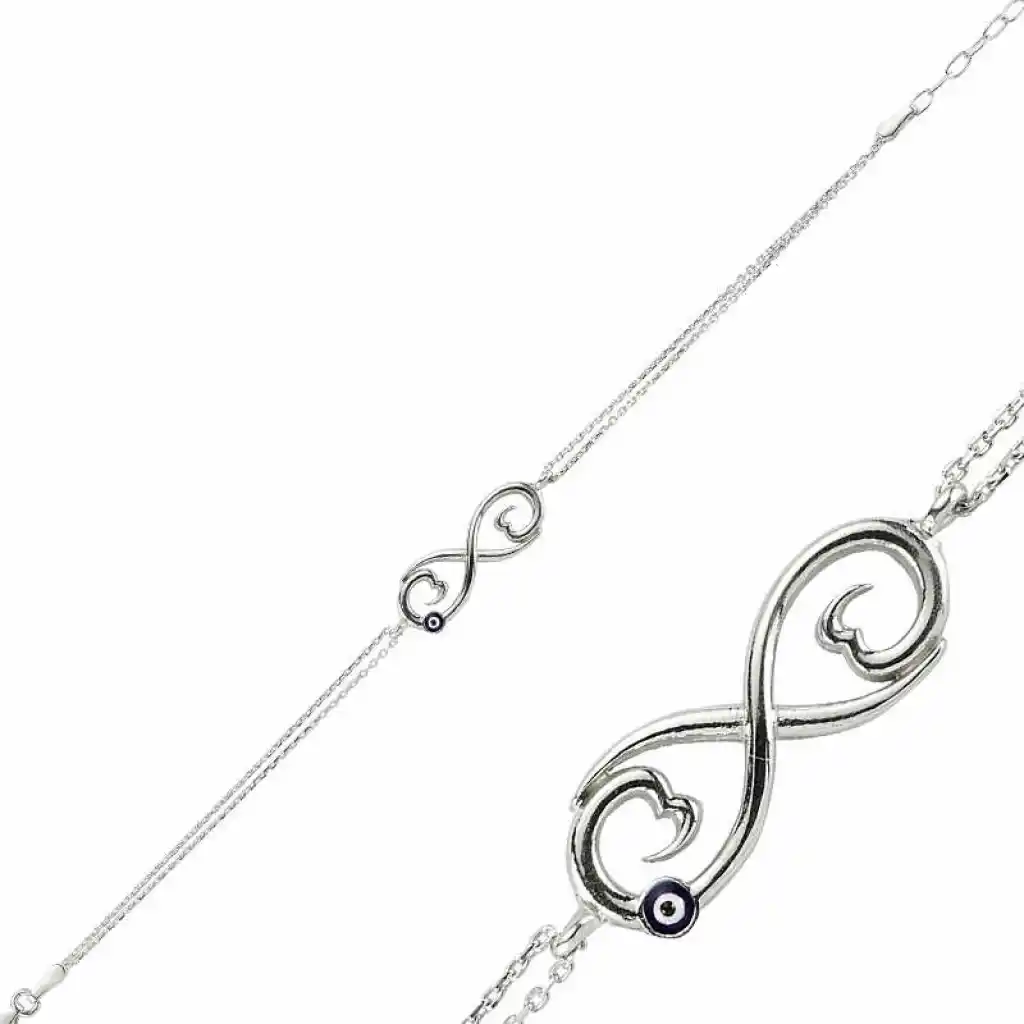 Sevdiklerinize sonsuz aşkı ifade etmenin en güzel en anlamlı yollarından biride bu nazar boncuklu sonsuzluk bilekliktir. Sevdiklerinize hediye edeceğiniz bu özel gümüş bileklik ile ona olan sonsuz sevginizi ifade edebilir sonsuza kadar birlikte olacağınız mesajı verebilirsiniz. 925 ayar gümüşten imal edilmiştir. Gümüş üzerine rodyum kaplama yapılmıştır. Rodyum kaplama yapılan bayan gümüş bileklik modelleri parlaklığını uzun süre muhafaza eder, oksitlenmesi gecikir. Tüm bileklik modellerimiz el emeği ile üretilmiştir. Gümüş ve değerli taşlar nedeniyle belirtilen ortalama ürün ağırlığında ± %10 sapma olabilmektedir.