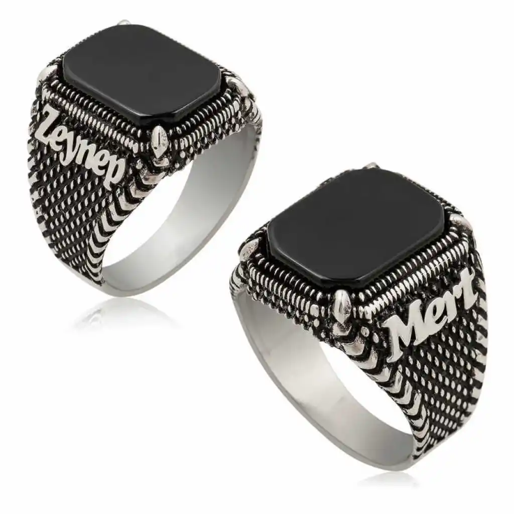 Gümüş Oniks Taşlı İsim Yazılabilen Erkek Yüzük
