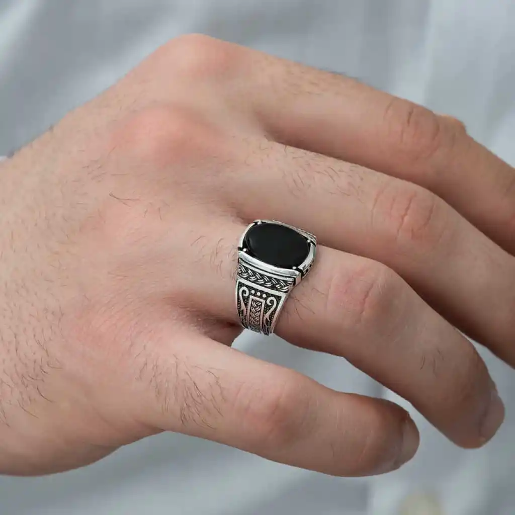 Milyonlarca yıl içerisinde yeryüzüne ulaşan oniks taşı, kayaçların ve bazı bileşenlerin ısınma ve soğumasıyla zaman içerisinde bir araya gelmesi üzerinden oluşmuş bir taştır. Oniks taşı şans taşı olarak bilinmekte olup yarı değerli bir taş türüdür. Oniks, işlenebilir olması ve estetik olarak şık durması sebebiyle eski çağlardan günümüze dek çeşitli süs eşyaları ve takıların yapımında kullanılmıştır. Oniks taşı toprak grubu burçları olan Boğa, Başak ve Oğlak’ın kutsal taşıdır. Bu burca sahip kişiler oniks taşlı aksesuarları tercih ederek negatif enerjiden korunabilirler. Bu şık yüzüğü; kendinize ya da sevdiklerinize doğum gününde, babalar gününde ve diğer özel günlerde hediye edebilirsiniz. Bu şık yüzük 925 ayar gümüşten imal edilmiştir. Gümüş üzerine oksit kaplama yapılmıştır. Oksit kaplama yapılan yüzükler otantik bir görünüme kavuşur. Tüm erkek yüzüklerde olduğu gibi gümüş oniks taşlı örgü desenli erkek yüzük modeli de el emeği ile üretilmiştir. Gümüş ve değerli taşlar nedeniyle belirtilen ortalama ürün ağırlığında ± %10 sapma olabilmektedir.