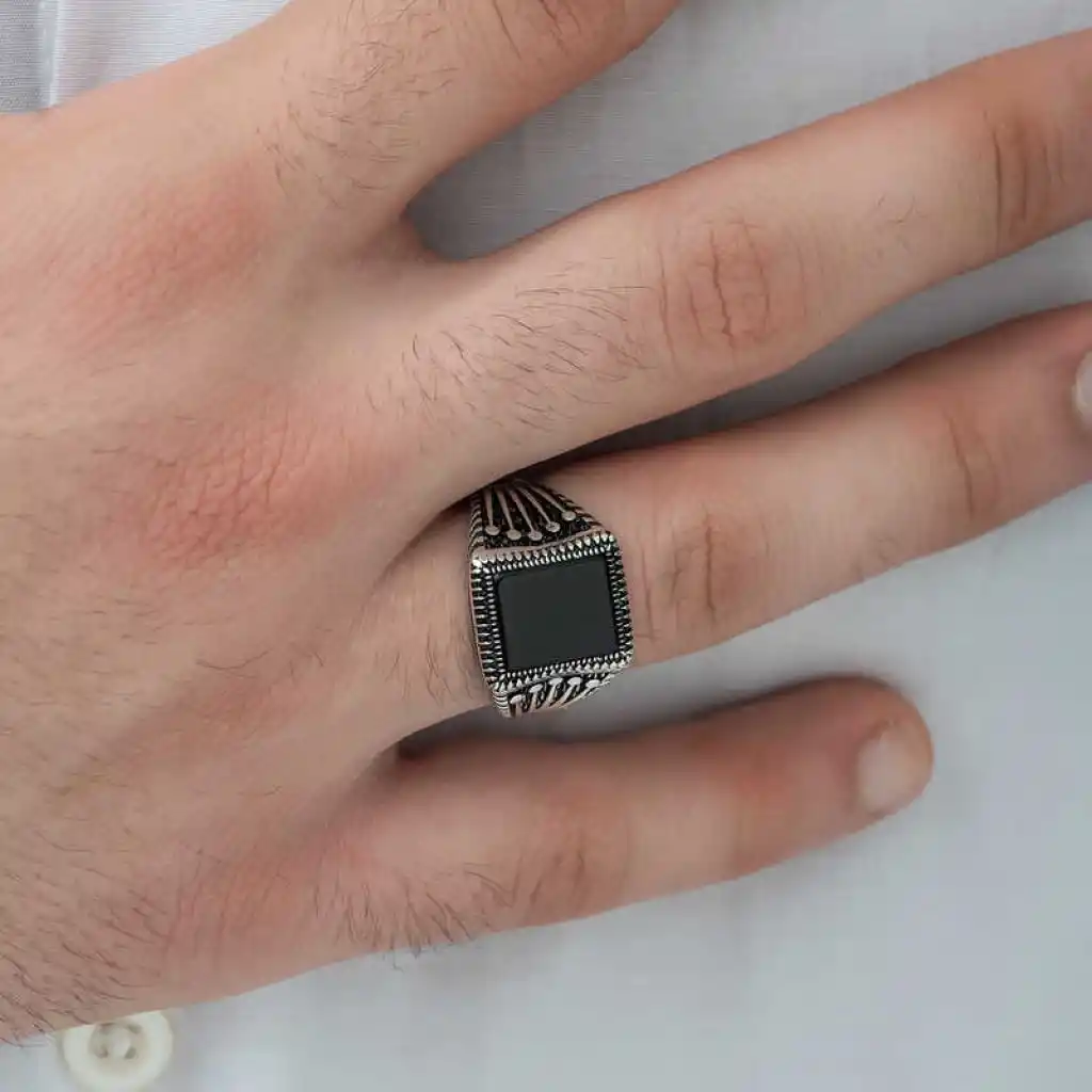 Milyonlarca yıl içerisinde yeryüzüne ulaşan oniks taşı, kayaçların ve bazı bileşenlerin ısınma ve soğumasıyla zaman içerisinde bir araya gelmesi üzerinden oluşmuş bir taştır. Oniks taşı şans taşı olarak bilinmekte olup yarı değerli bir taş türüdür. Oniks, işlenebilir olması ve estetik olarak şık durması sebebiyle eski çağlardan günümüze dek çeşitli süs eşyaları ve takıların yapımında kullanılmıştır. Oniks taşı toprak grubu burçları olan Boğa, Başak ve Oğlak’ın kutsal taşıdır. Bu burca sahip kişiler oniks taşlı aksesuarları tercih ederek negatif enerjiden korunabilirler. Yüzüğün yanlarında bulunan parmak şeklindeki taç işareti, ustanın hünerli parmaklarını sembolize etmektedir. Bir diğer yandan kral tacı görüntüsü ile de güç, iktidar ya da soyluluk simgesi olarak nitelendirilmektedir. Bu şık yüzüğü; kendinize ya da sevdiklerinize doğum gününde, babalar gününde ve diğer özel günlerde hediye edebilirsiniz. Bu şık yüzük 925 ayar gümüşten imal edilmiştir. Gümüş üzerine oksit kaplama yapılmıştır. Oksit kaplama yapılan yüzükler otantik bir görünüme kavuşur. Tüm erkek yüzüklerde olduğu gibi gümüş oniks taşlı örgü desenli erkek yüzük modeli de el emeği ile üretilmiştir. Gümüş ve değerli taşlar nedeniyle belirtilen ortalama ürün ağırlığında ± %10 sapma olabilmektedir.