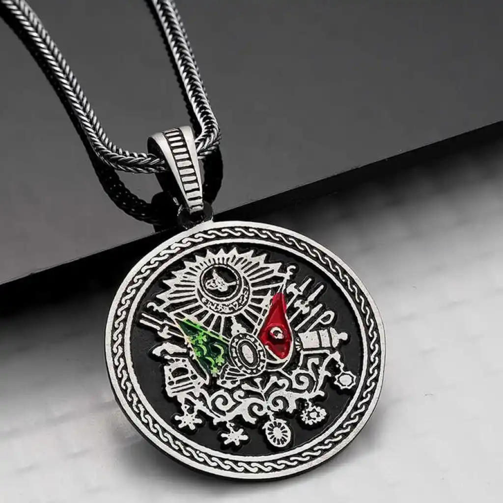 Osmanlı İmparatorluğu Devlet Arması, 19. yüzyılda Osmanlı Devleti için hazırlanmıştır. Ondan önce, padişahların tuğraları devlet nişanı yerine geçiyordu. Osmanlı nişanının son halini 1882"de Sultan II. Abdülhamit tarafından yürürlüğe konmuştur. Osmanlı Devlet Nişanı"nın içinde iki tane bayrak vardır. Kırmızı zeminde ay-yıldız bulunan bayrak Osmanlı Hanedanı"nı, yeşil zemindeki bayrak İslam halifeliğini simgelemektedir. Terazi, Osmanlı adaletini, terazide bulunan kitaplar da adaletin kaynağı olan Osmanlı kanunnamelerini ve Kur"an-ı Kerim"i temsil etmektedir. Bu şık kolyeyi sevdiklerinize doğum günlerinde, özel günlerde veya babalar gününde hediye edebilir onları sevindirebilirsiniz. Bu özel tasarım erkek kolye 925 ayar gümüşten imal edilmiştir. Gümüş üzerine oksit kaplama yapılmıştır. Tüm gümüş erkek kolyelerinde olduğu gibi gümüş osmanlı armalı erkek kolye de el emeği ile üretilmiştir. Gümüş ve değerli taşlar nedeniyle belirtilen ürün ağırlığında ± %10 sapma olabilmektedir.