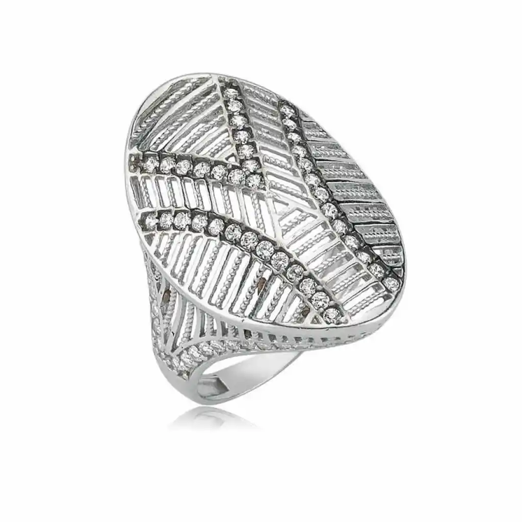 Oval bayan yüzük modeli 925 ayar gümüşten imal edilmiştir. Gümüş yüzük üzerine rodyum kaplama yapılmıştır. Rodyum kaplama yapılan gümüş bayan yüzük modelleri parlaklığını uzun süre muhafaza eder, oksitlenmesi gecikir. Gümüş oval bayan yüzük üzerinde bulunan beyaz taşlar zirkondur. Gümüş yüzük modellerinin tamamı el emeği ile üretilmiştir. Gümüş ve değerli taşlar nedeniyle belirtilen ortalama ürün ağırlığında ± %10 sapma olabilmektedir.