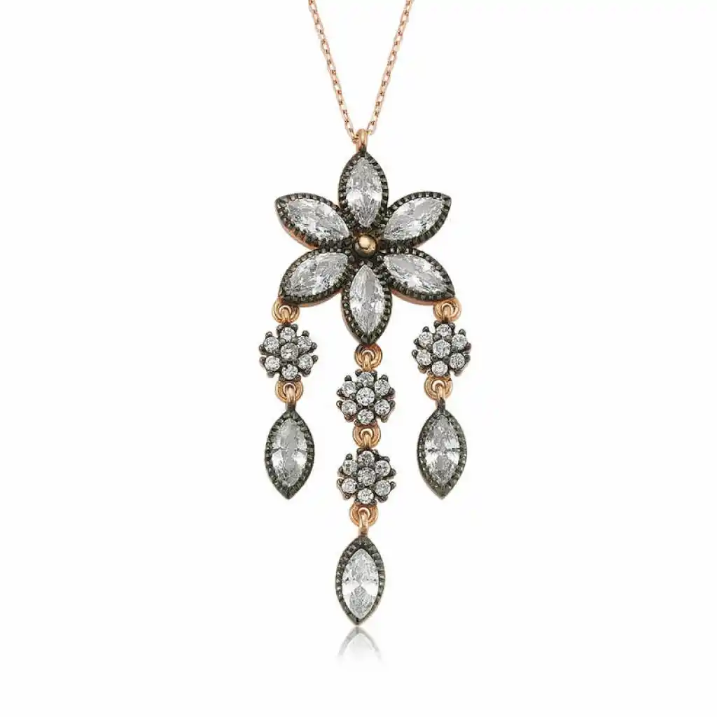 Papatya çiçeği temiz sevgi anlamını ifade eder. En büyük özelliklerinden biri her sapında bir tane olmasıdır. Bu güzellik tasarlanarak ortaya çıkan bu ışıl ışıl kolye zirkon taşlarla süslendi... Bu şık kolye; doğum günü hediyesi, sevgililer günü hediyesi veya annelere hediye olarak özel günlerde tercih edilebilecek mükemmel bir seçenektir. Papatya bayan kolye modeli 925 ayar gümüşten imal edilmiştir. Bu kolye üzerinde rose altın kaplama vardır. Rose altın kaplama yapılan ürünler parlaklığını uzun süre muhafaza eder, gümüş rengini pembe renge çevirir. Üzerinde bulunan ışıl ışıl taşlar zirkondur. Tüm gümüş bayan kolye modellerimizde olduğu gibi gümüş papatya bayan kolye de el emeği ile üretilmiştir. Gümüş ve değerli taşlar nedeniyle ürün ağırlığında ± %10 sapma olabilmektedir.