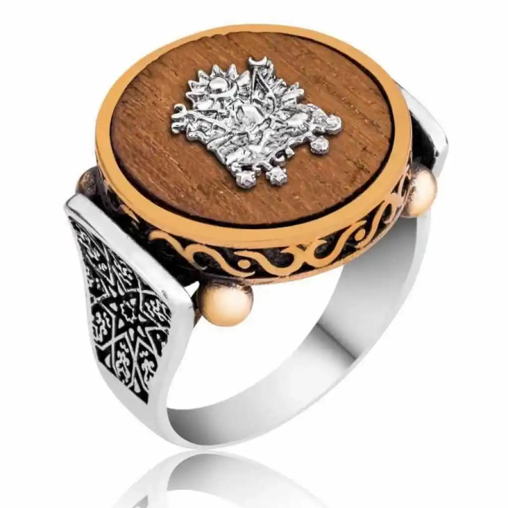 Osmanlı İmparatorluğu Devlet Arması, 19. yüzyılda Osmanlı Devleti için hazırlanmıştır. Ondan önce, padişahların tuğraları devlet nişanı yerine geçiyordu. Osmanlı nişanının son halini 1882"de Sultan II. Abdülhamit tarafından yürürlüğe konmuştur. Osmanlı Devlet Nişanı"nın içinde iki tane bayrak vardır. Kırmızı zeminde ay-yıldız bulunan bayrak Osmanlı Hanedanı"nı, yeşil zemindeki bayrak İslam halifeliğini simgelemektedir. Terazi, Osmanlı adaletini, terazide bulunan kitaplar da adaletin kaynağı olan Osmanlı kanunnamelerini ve Kur"an-ı Kerim"i temsil etmektedir. Bu şık yüzüğü sevdiklerinize doğum günlerinde, özel günlerde veya babalar gününde hediye edebilir onları sevindirebilirsiniz. Bu özel tasarım erkek yüzük 925 ayar gümüşten imal edilmiştir. Gümüş üzerine oksit kaplama yapılmıştır. Yüzük taşı pelesenk ağacından yapılmıştır. Tüm gümüş erkek yüzüklerinde olduğu gibi gümüş osmanlı armalı erkek yüzük de el emeği ile üretilmiştir. Üzerindeki pelesenk ağacıdır. Gümüş ve değerli taşlar nedeniyle belirtilen ürün ağırlığında ± %10 sapma olabilmektedir.