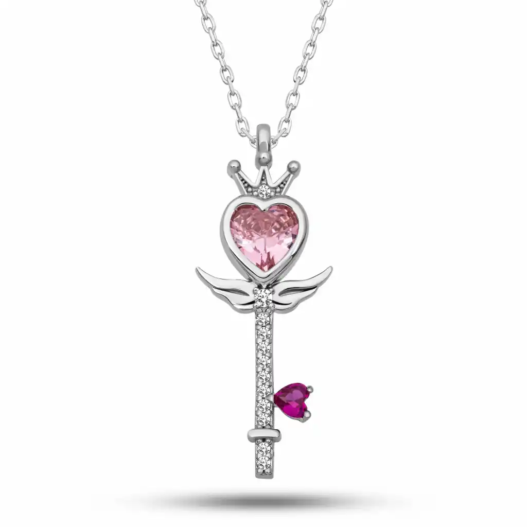 Zarafetin ve aşkın sembolü bu özel tasarım Gümüş Kalp Taç Anahtar Kolye, ışıltısıyla her anınıza büyü katıyor. Kalp biçimindeki pembe taş, sevginin saf halini temsil ederken, tacın asaletini ve anahtarın gizemini bir araya getiriyor.925 ayar gümüşten üretilen bu kolye, hem günlük kullanımlarda hem de özel davetlerde tarzınıza zarif bir dokunuş kazandırır. İnce detaylarla işlenmiş taş süslemeleriyle göz kamaştıran bu model, sevdiklerinize anlamlı bir hediye seçeneği olarak da öne çıkar. Gümüş ve değerli taşlar nedeniyle belirtilen ortalama ürün ağırlığında ± %10 sapma olabilmektedir.