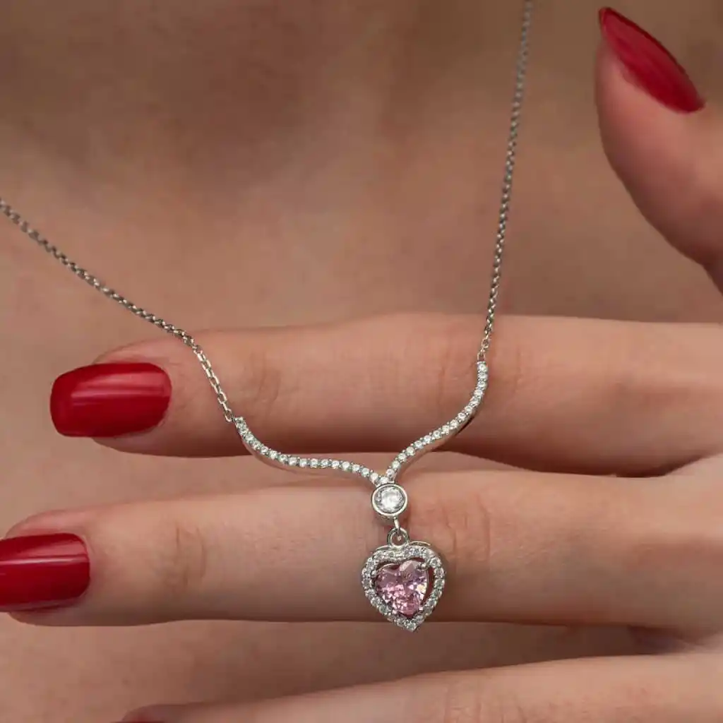 Gümüş Pembe Zirkon Taşlı Kalp Kadın Kolye