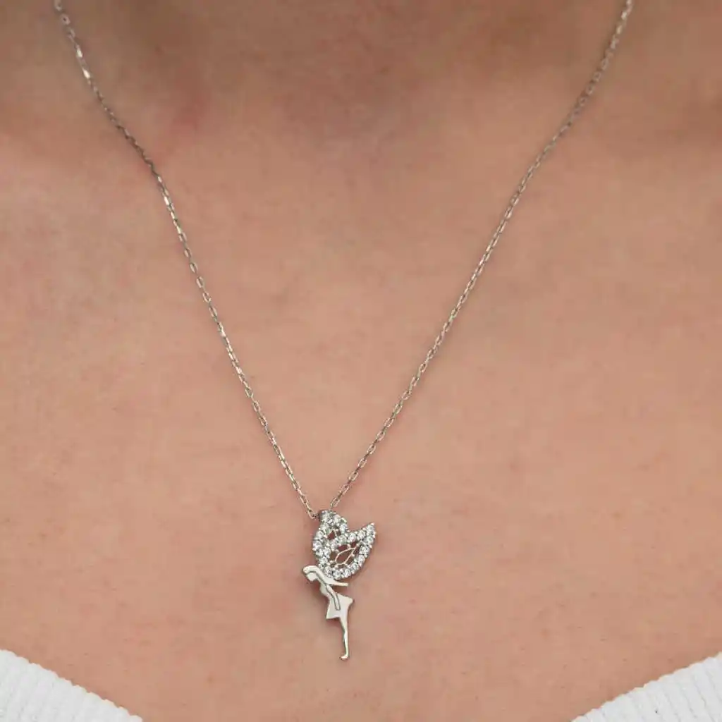 Hayal dünyasının sembolü olan peri kızı figürü ile tasarlanmış bu kolye, hem zarafeti hem de özgünlüğüyle her tarza uyum sağlar.Uçsuz bucaksız bir hayal dünyasının kapılarını aralamak için Peri kızı kadın kolyeyi sevdiklerinize hediye etmek için mükemmel bir seçenektir.Gümüş üzerine rodyum kaplama yapılmıştır.Rodyum kaplama yapılan kolyeler parlaklığını uzun süre muhafaza eder ve oksitlenmesi gecikir.Gümüş ve değerli taşlar nedeniyle belirtilen ortalama ürün ağırlığında ± %10 sapma olabilmektedir.