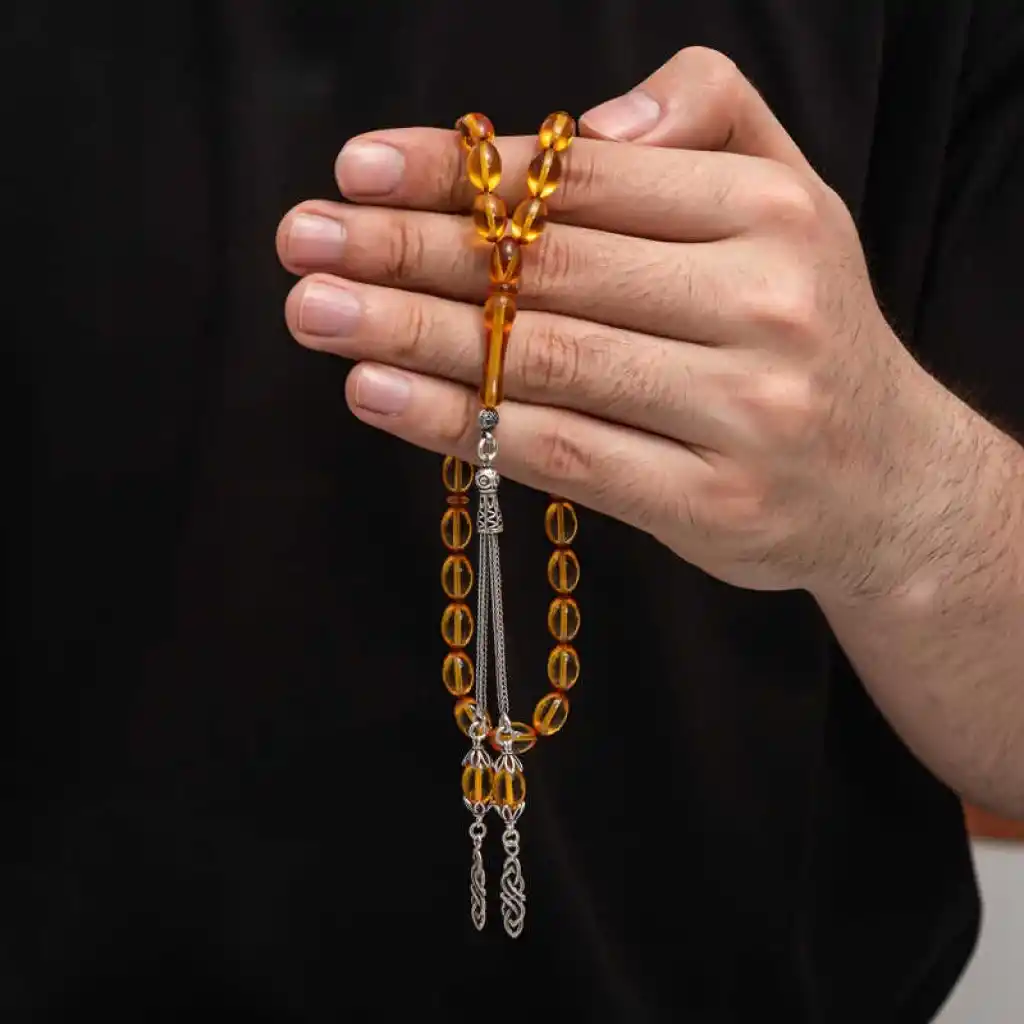 Kehribar, çam ağacı reçinesinin toprak altında uzun yıllar boyunca birikerek oluşan bir maddedir. Hemen hemen taş ile aynı sertliktedir fakat yoğunluğu düşüktür. Çam kokusu yayar. Oluşumu uzun zaman aldığından ve yapay olarak yapılamadığından değerli bir maddedir. Sıkma kehribar ise kehribar taşından farklı olarak onun özelliklerini taşıyan, görüntü itibariyle ona benzeyen fakat gerçek olmayan bir malzemedir. Ülkemizde ve dünyanın bir çok yerinde kehribar taşından çeşitli malzemeler üretilmiştir. Ülkemizde en yaygın olarak tesbih üretilmektedir. Kehribar tesbihler elde ısındıkça kehribar benzeri bir koku verir ve renk değiştirir. Bir çok rengi vardır. Hatta iki rengin birleşiminden oluşan kehribar tesbih modelleri de vardır. Genellikle gümüş püskül ile kullanılır veya sistemli olarak da kullanılabilir. Ülkemizin güzide tesbih ustaları bu malzemeyi sıklıkla işlemek suretiyle çeşitli sanat eserleri meydana getirirler. Bu tesbihler de koleksiyonerler tarafından alınıp satılmaktadır. Gümüş püsküllü sıkma kehribar tesbih modeli de günlük hayatta kullanılabilecek çok şık bir tesbih çeşididir. Özel günlerin vazgeçilmez hediyesi sıkma kehribar tesbihler erkekler için doğum günü, sevgililer günü ve babalar günü gibi özel zamanlarda hediye olarak tercih edilebilir. Gümüş püsküllü sıkma kehribar tesbih modeli diğer kehribar tesbih modellerinde olduğu gibi tamamen el emeği ile imal edilmiştir.