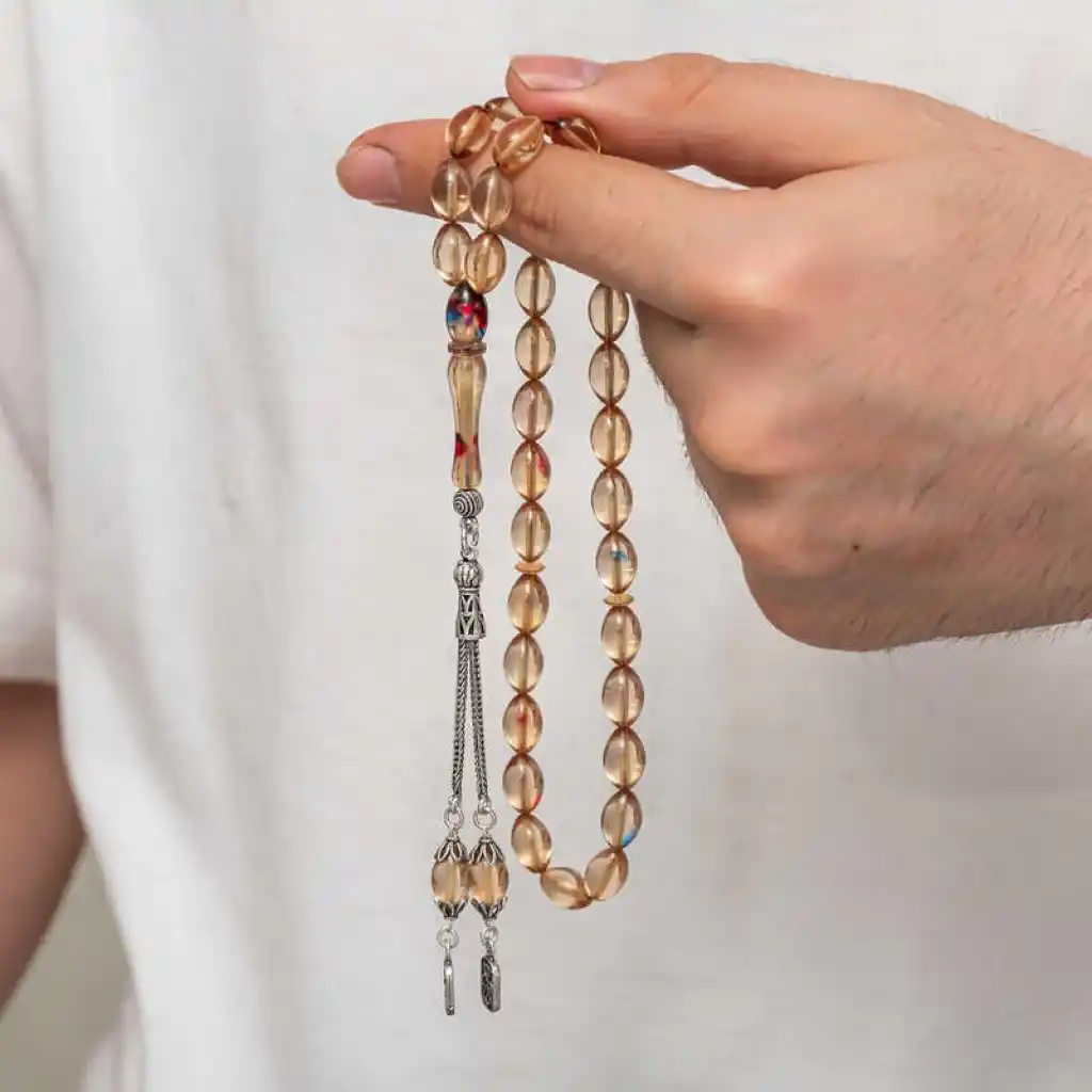Kehribar, çam ağacı reçinesinin toprak altında uzun yıllar boyunca birikerek oluşan bir maddedir. Hemen hemen taş ile aynı sertliktedir fakat yoğunluğu düşüktür. Çam kokusu yayar. Oluşumu uzun zaman aldığından ve yapay olarak yapılamadığından değerli bir maddedir. Sıkma kehribar ise kehribar taşından farklı olarak onun özelliklerini taşıyan, görüntü itibariyle ona benzeyen fakat gerçek olmayan bir malzemedir. Ülkemizde ve dünyanın bir çok yerinde kehribar taşından çeşitli malzemeler üretilmiştir. Ülkemizde en yaygın olarak tesbih üretilmektedir. Kehribar tesbihler elde ısındıkça kehribar benzeri bir koku verir ve renk değiştirir. Bir çok rengi vardır. Hatta iki rengin birleşiminden oluşan kehribar tesbih modelleri de vardır. Genellikle gümüş püskül ile kullanılır veya sistemli olarak da kullanılabilir. Ülkemizin güzide tesbih ustaları bu malzemeyi sıklıkla işlemek suretiyle çeşitli sanat eserleri meydana getirirler. Bu tesbihler de koleksiyonerler tarafından alınıp satılmaktadır. Gümüş püsküllü sıkma kehribar tesbih modeli de günlük hayatta kullanılabilecek çok şık bir tesbih çeşididir. Özel günlerin vazgeçilmez hediyesi sıkma kehribar tesbihler erkekler için doğum günü, sevgililer günü ve babalar günü gibi özel zamanlarda hediye olarak tercih edilebilir. Gümüş püsküllü sıkma kehribar tesbih modeli diğer kehribar tesbih modellerinde olduğu gibi tamamen el emeği ile imal edilmiştir.